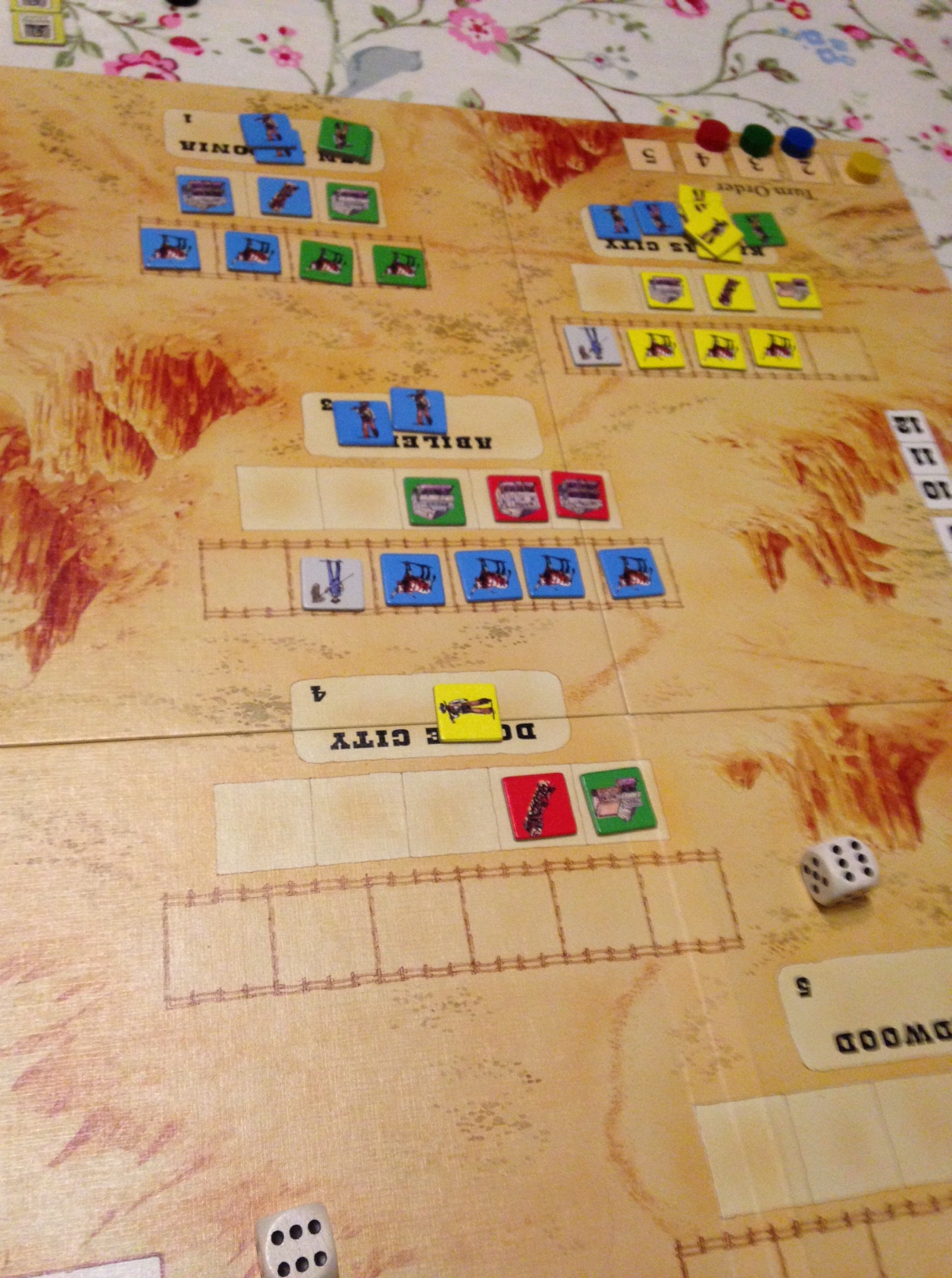 I like this game and want to play it again. It’s pretty past. there’s a LOT of in your face aggression (although we may have taken this a bit far as there wasn’t a whole passel of development, just a few wounded cowboys and a lot of cattle and tumbleweed at the end). It’s a semi worker placement game for want of a better term. it’s not so much about cock blocking other locations on players although this does play a part, it’s more about and a lot of fun for that russeling cattle, muscling in on other players patches and generally causing mayhem whilst trying to maintain your own economy.