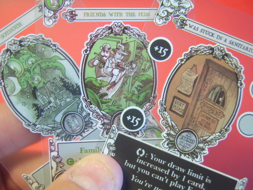 Cthulhu Gloom is a themed version of Gloom (I sound like I played gloom but I haven’t).  It features a very nice mechanic of transparent cards which fit over each other and add bonus/negatives to each of the cards.  The weird story is, you have to depress your four family members and then bump them off (no I have no idea why) and then everyone scores the depressed score for all your dead family members…..  yes it’s a bit weird, but it’s not bad.  Certainly a filler and at the late hour it was played it was tough to get an overall picture of it.  The cards really are excellent, the whole transparent thing is superb
