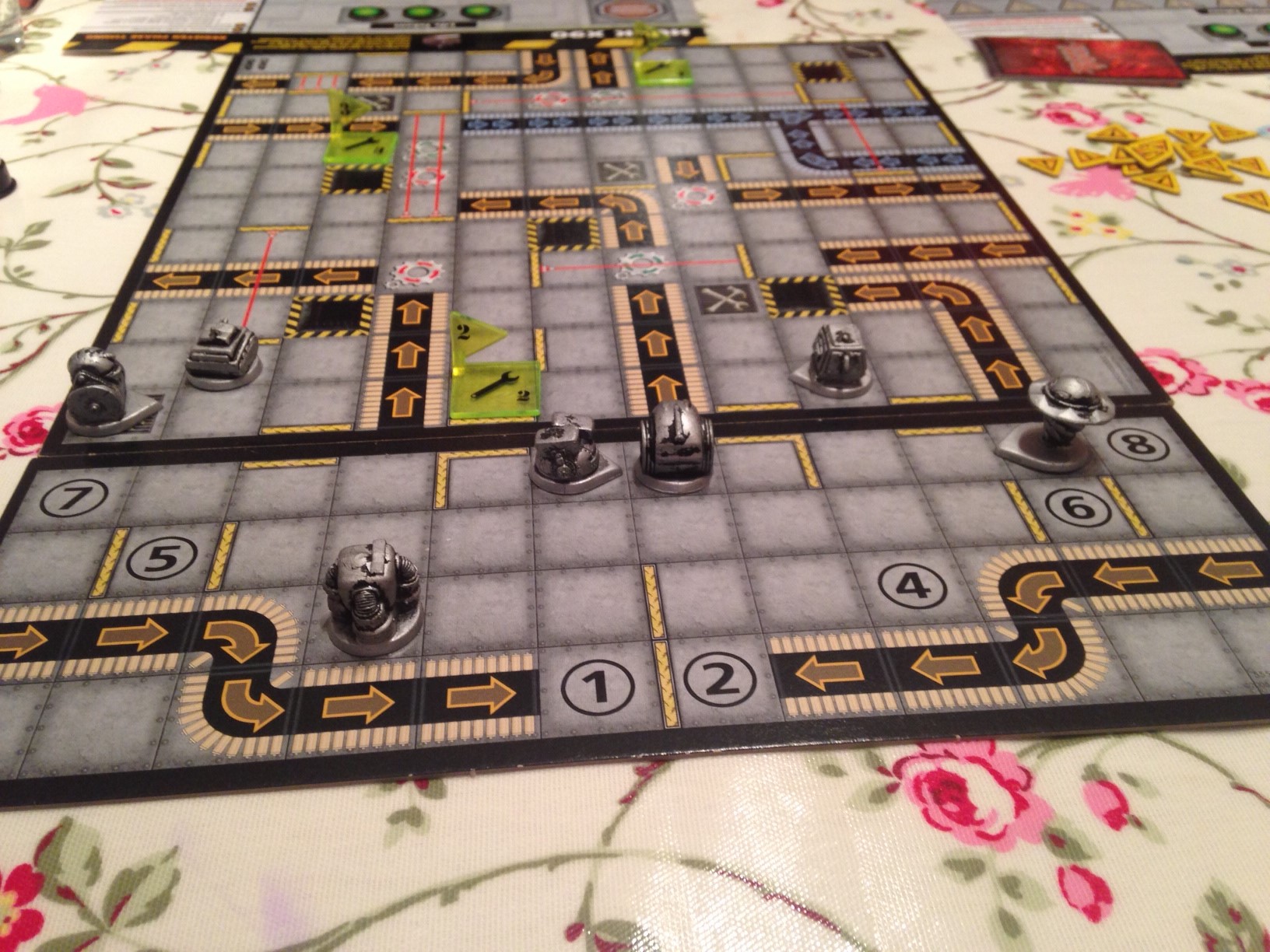 Each person takes a robot (all of which are the same) and has to give it a set of instructions to navigate around the factory BigTrak Style. The factories made up of a grid of square with contain empty spaces and various traps like any good factory should. Hazards like conveyor belts, lasers, rotators, pushers, bottomless pits and so on litter the play area and it’s obvious that the same team that did the safety audit on the Death Star we’re signed up to do the one on this factory.