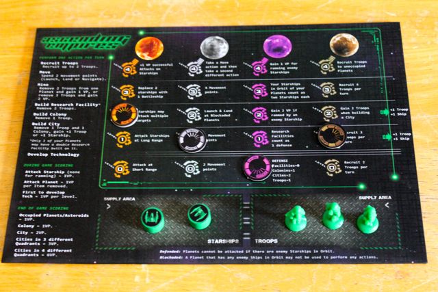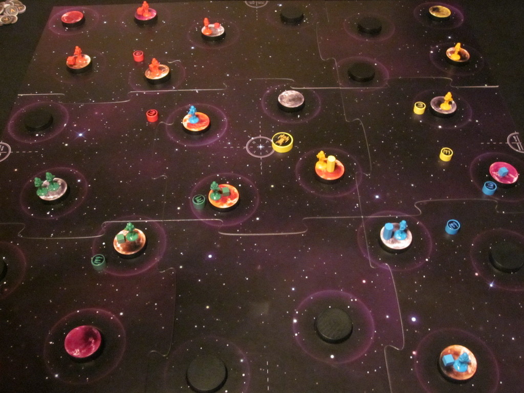It’s been a while since I’d played it but I remembered how to setup the board so it was all go after that. In AE you start with a handful of troops and two small ships. The board consists of a scattering of random colored planets (facedown) and you flick your ships across the uneven surface and if you get in orbit of a planet you can land your troops and take it over. Once established on a planet you can build colonies and cities (adds defense and bonus points at end game) and research centers. These are key and allow you extra abilities and options depending on which tech branch you pursue