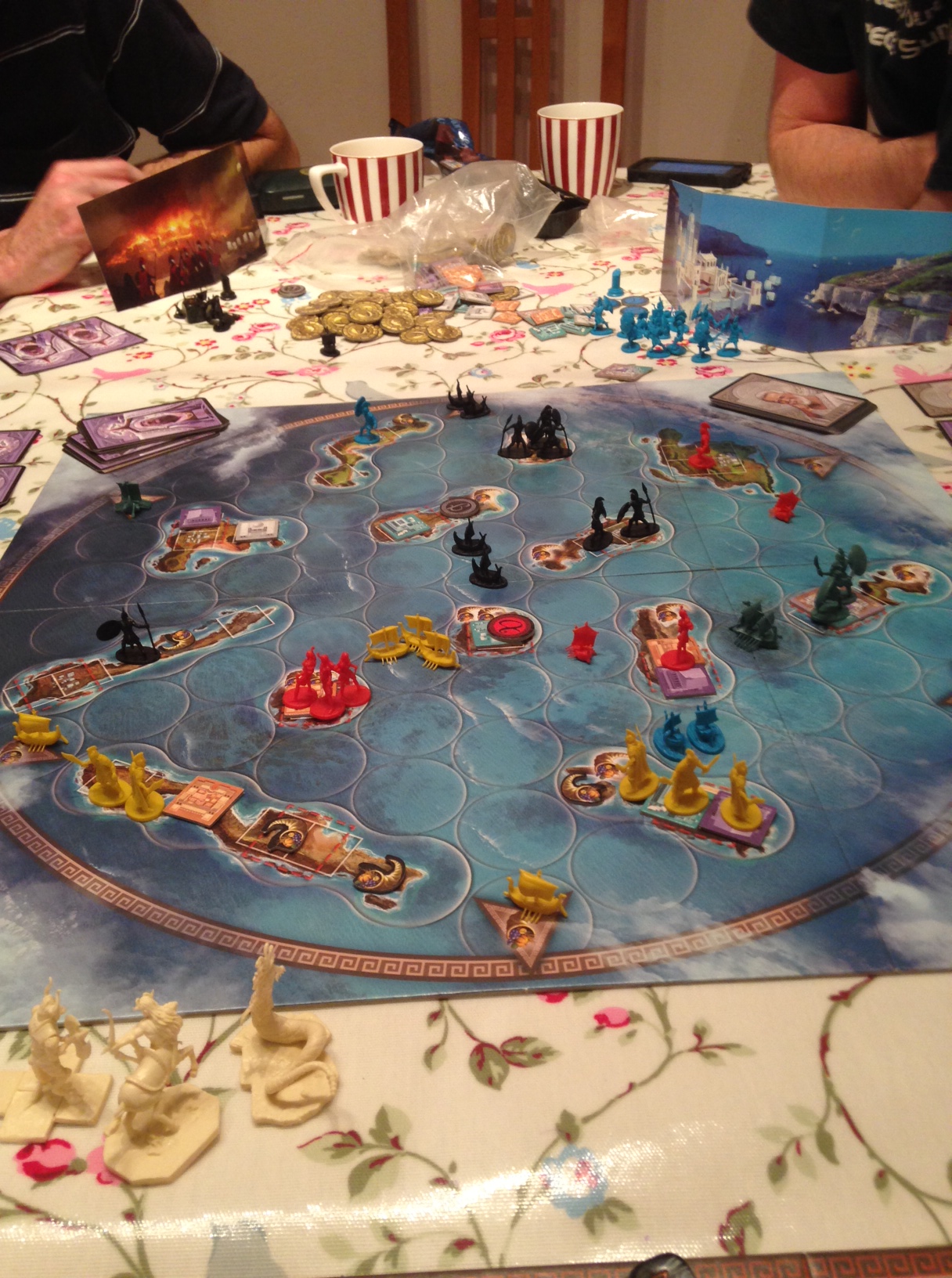 There’s a bidding element to it too where you try and favour one of the gods who’s in charge of ships (go on guess his name), land troops, priests or colleges along with a fifth god which is a sort of god of social welfare who doles out coins and horns of plenty (+1 coins per turn)