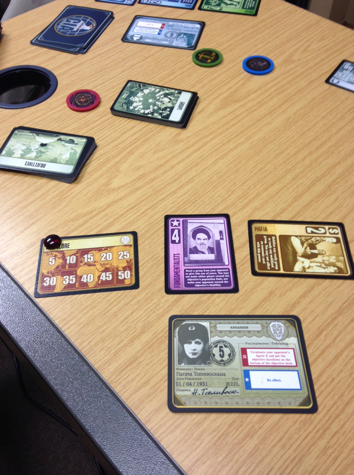 each player picks an agent to do their dirty work for that round and you take it in turn to draw and place groups from a face down stack up to the max that can be shoehorned into that objective. It’s awfully like blackjack where you want to get close to the max level of influence for that region but not go bust. Go bust and your opponent wins. Unlike black jack however you have a lot more control of the cards once picked and it’s quite possible to recover from a losing position