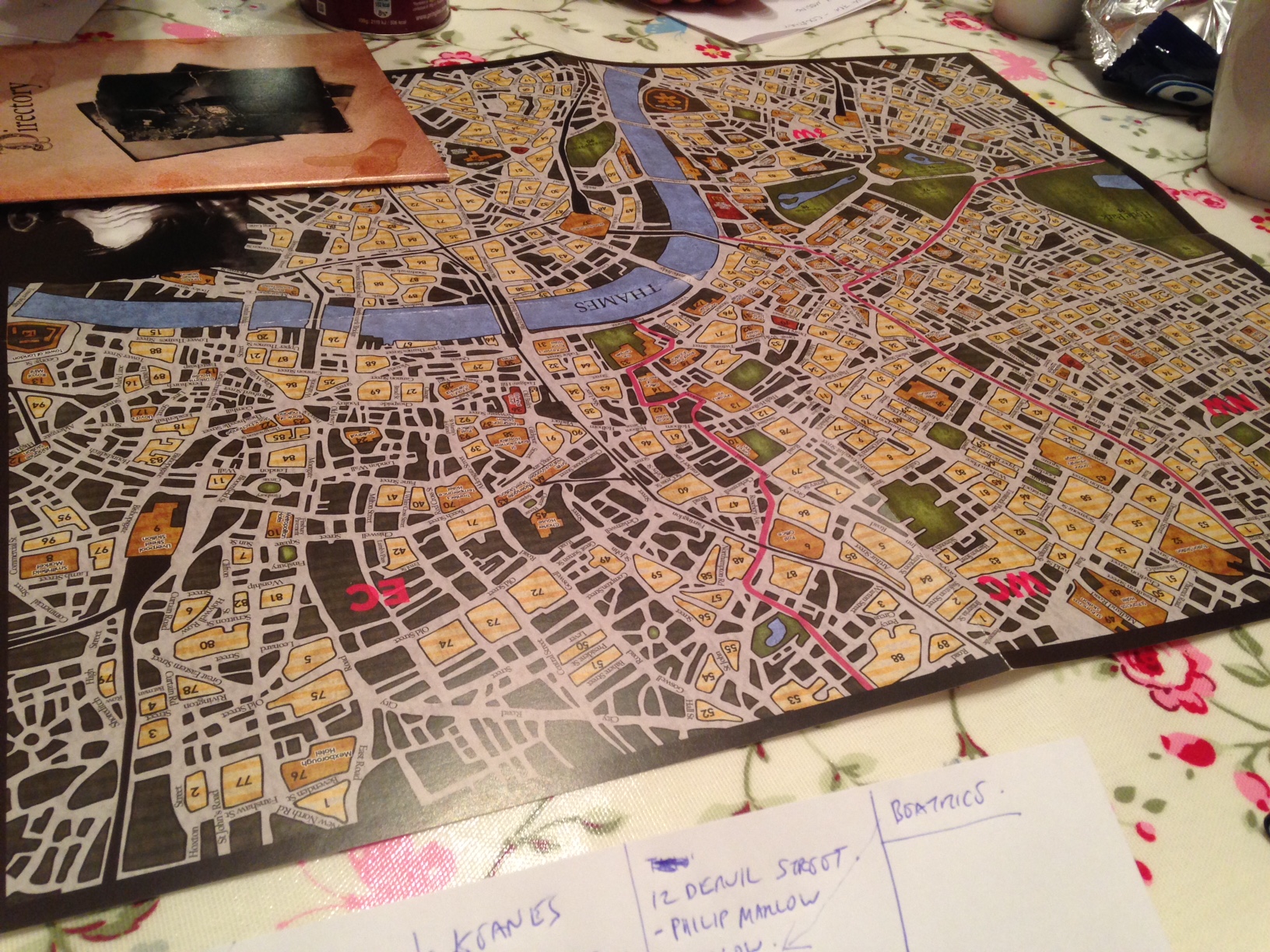 The game comes with a map of London with a hundred odd locations and ten case books for a variety of murders, robberies and so on. It’s very thematic, each adventure comes with it’s own newspaper which may contain clues to the current mystery.