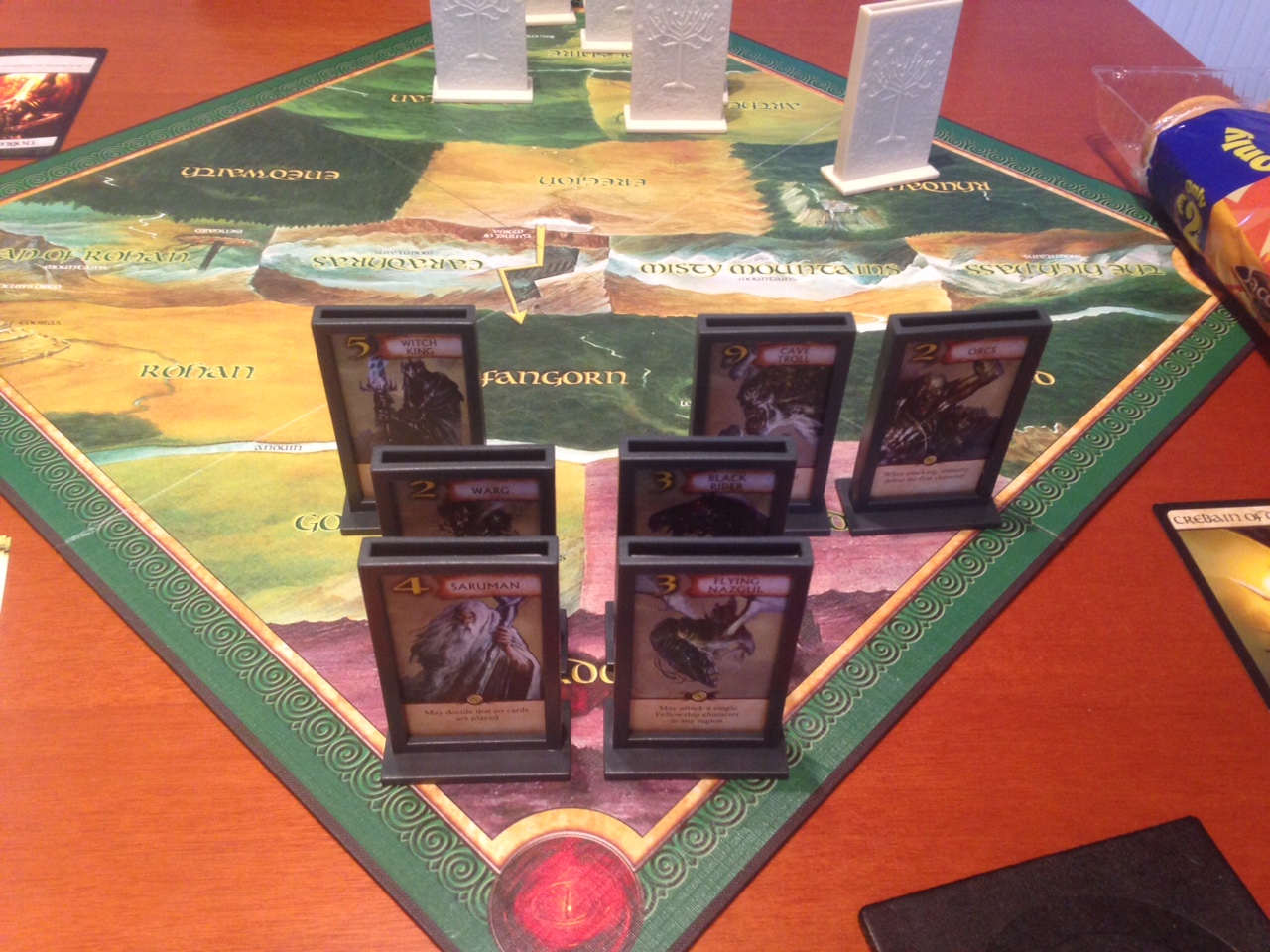 The Trick to this game is the subterfuge. Your characters are only visible to you. The other side of the stand they’re on is opaque, so you spend your time double and triple guessing your opponent. Each character has a special ability. Pippin kills the witch king if they meet in combat. Sean Bean kills both himself and whomever the opponent is in combat. The Nazgul can attack anywhere on the map and so on. It’s pretty balanced. I couldn’t find any massive advantage on either side even though they are a good bit different. The fellowship tend to be a bit weaker in fights but make up for it with their special abilities. The Sauron forces are militarily more powerful but really need to root out Frodo to have a chance.