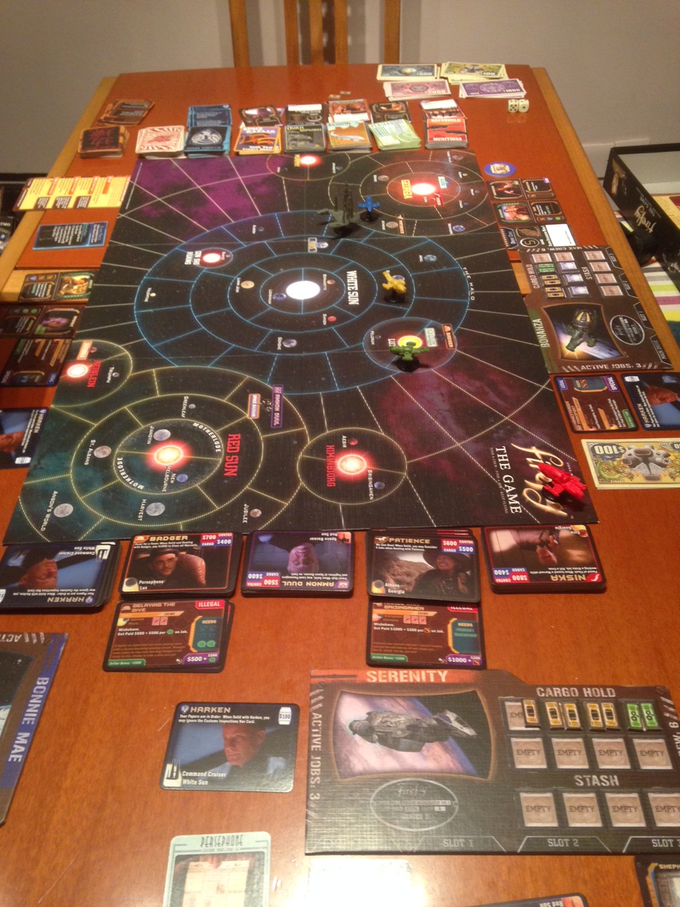 Vic, you also need Blue Sun. I actually enjoyed the base game, and there are possibilities for screwage using the Reavers as a blocker. It’s Blue Sun that really makes that into a full-blown mechanic, with the addition of two more Reavers. Pirates and Bounty Hunters is a good expansion, but it makes the game very mean. It swings too far from the base game’s ‘peaceful’ trading into full-on ‘gotcha’. Blue Sun balances it out really well. Normally, I’d agree with you that a game in a box ought to be complete, but actually encountering the expansions as they have come out has made the game feel like it’s broadening without overwhelming you with it all in one go. It’s a pretty regular game on the SDBG tables. Of course, half the craic is the one-liners and all-round bonhommie. The game has a great ‘fun’ quality to it, although it also suffers from the dreaded ‘guy who gets totally screwed by the game and spends the hours getting more and more depressed’ effect. That said, it can swing around from defeat to victory. It’s classic Ameritrash, really – thematically rich, shiny, and more random than strategic, but there’s enough going on to definitely make it worth expanding and going back to. Come up to the Big Smoke some time and we’ll show you…