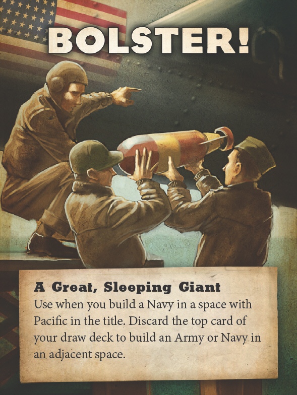 The game also introduces bolster cards. These are reactions (in some cases) and can be played directly from your hand as a reaction to someone else’s move or else cards that play out of sequence and setup a chain of plays. They’re interesting. Certainly way more interesting than reaction cards, which I found were a bit of a waste in the base game. That said I’ve never won as the Axis so what would I know.