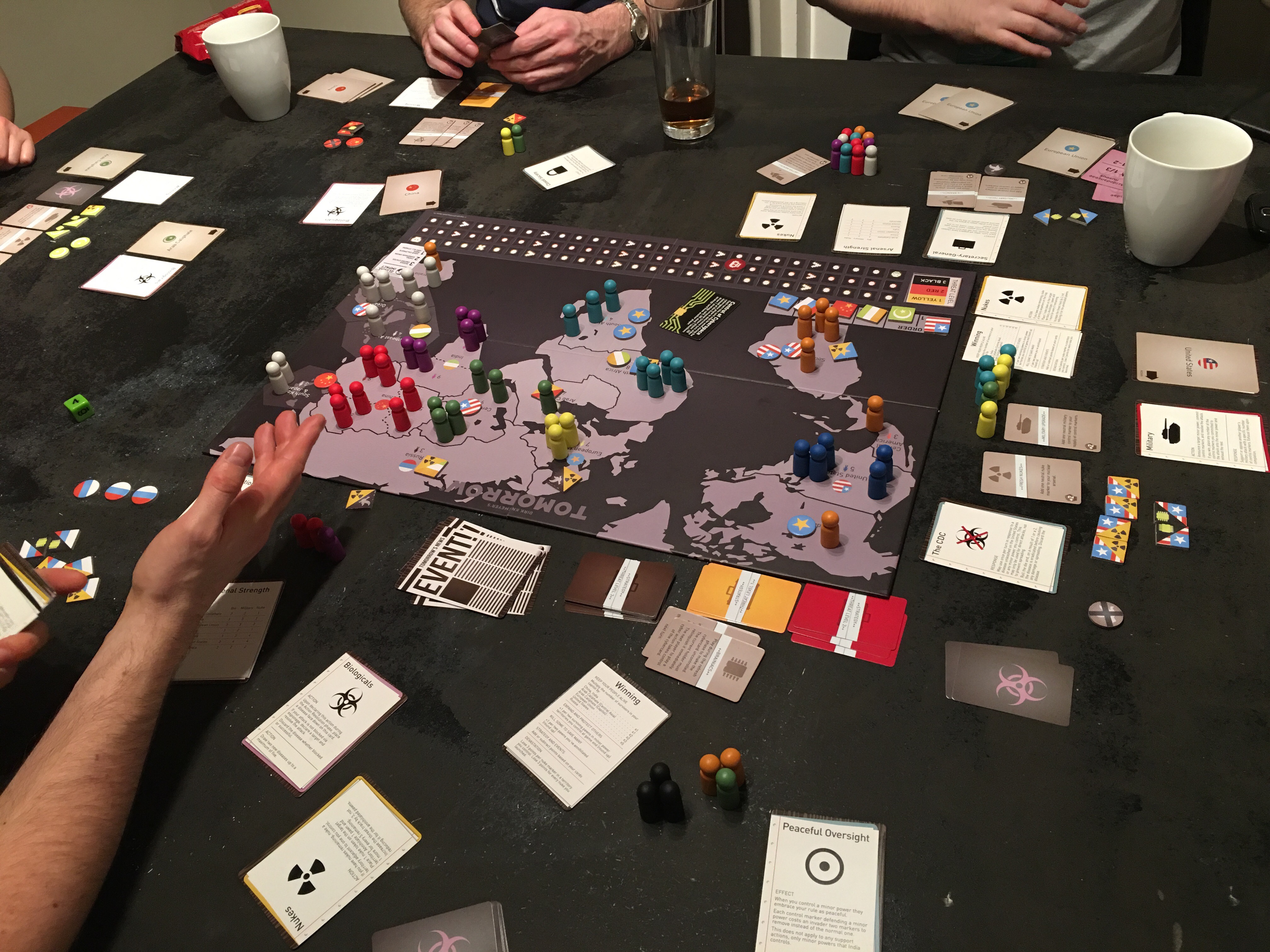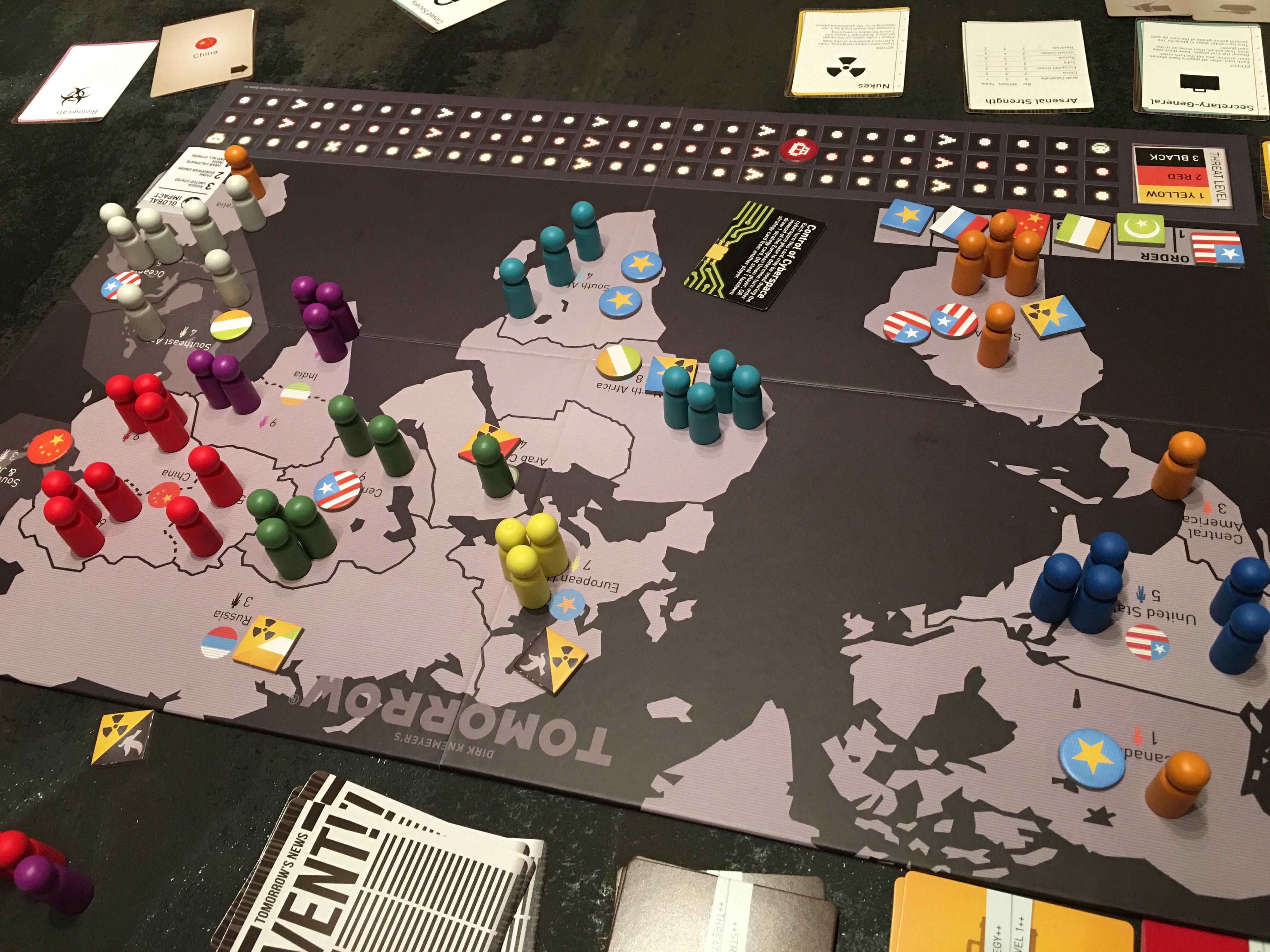 On paper (cardboard) it should work but in practice the actions are limited. Each turn you get to choose from two of five actions. Nuke, military, cyber attack, contagion, block. In truth the block, nuke and cyber attack are rarely taken. The nuclear option is very much a damp squid. The contagion after a round or two is weak as it removes a percentage rounded down in a lot of cases. So whomever gets in the first decent disease early on steals a huge march on everyone else and a lot of it is luck based.