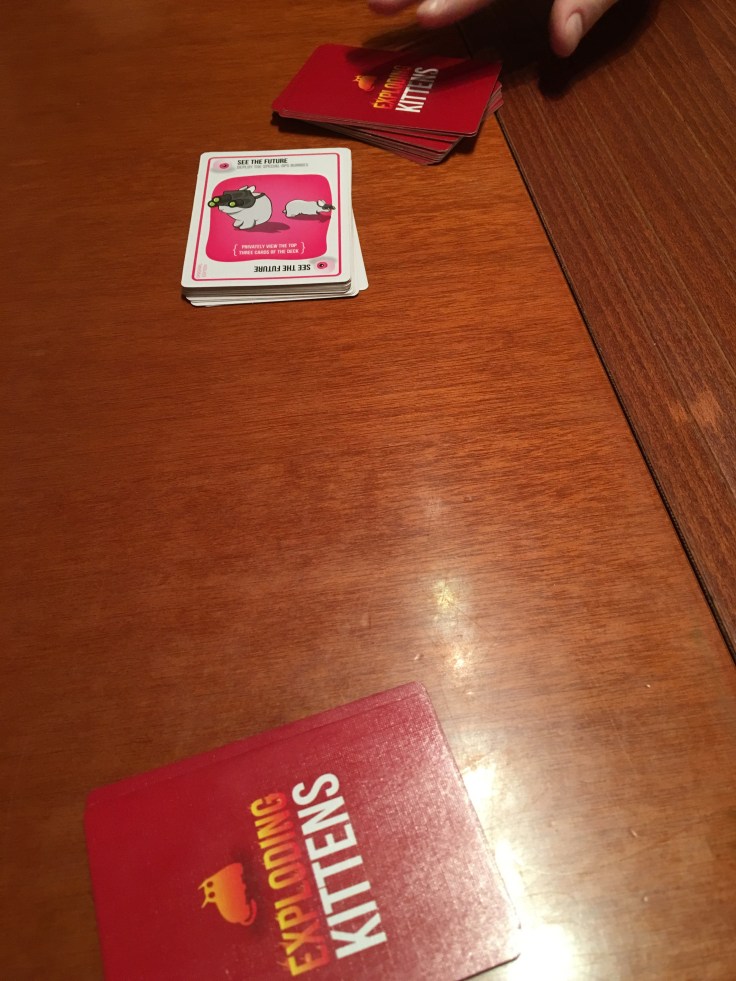 The game sees you trying to avoid drawing an exploding kitten from the draw deck. There’s one less than the number of players mixed in there so it’s last man standing.