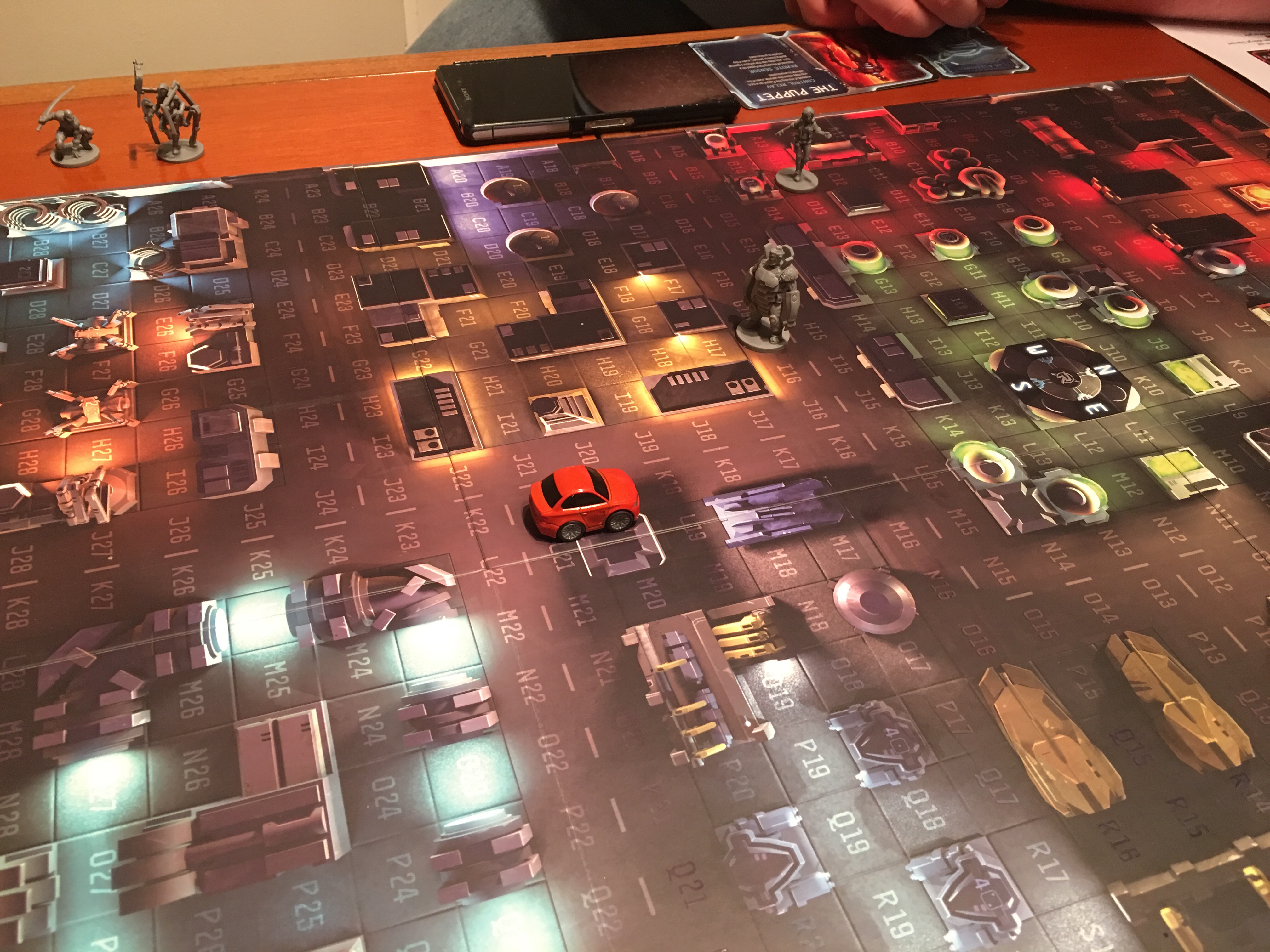 The defenders are a rum bunch all with interesting abilities. The wolfman dude can move half distance and “sniff” showing up the infiltrator if they’re within five spaces, the gun character is handy with a sniper rifle. The power dude can operate the team vehicle remotely. The team have for access to a zippy car that can zoom them across the map and also has a useful scanner which shows if the operative is north, south, east or west of the car.