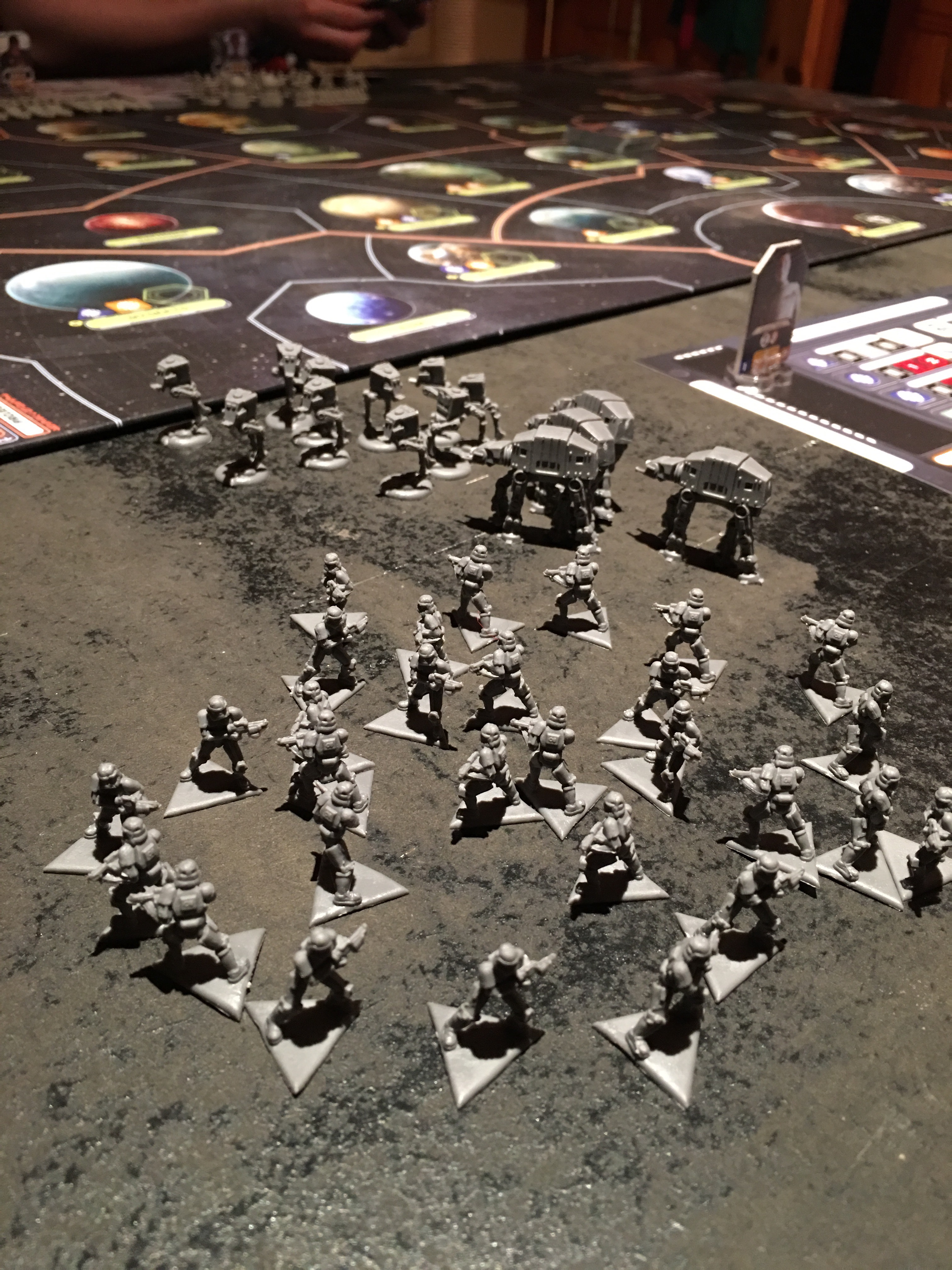 Battles occur when fleets meet. There’s two distinct battlegrounds per system. On the ground and in orbit. Both are exercised in the same fight and last boots standing rule the system. Battles are brutal and bringing more guns than your opponent is a goods move. Heroes bring tactics cards which inflict extra hits or reduce damage or much to the horror of the rebels we cornered in our first game stop them From bugging out when things look grim. The units have two types of attack dice. Anti small stuff and anti big stuff. Each unit fires a mix of these. Small stuff would be fighters and grunts. Big stuff would be AT ATs, speeders and capital ships.