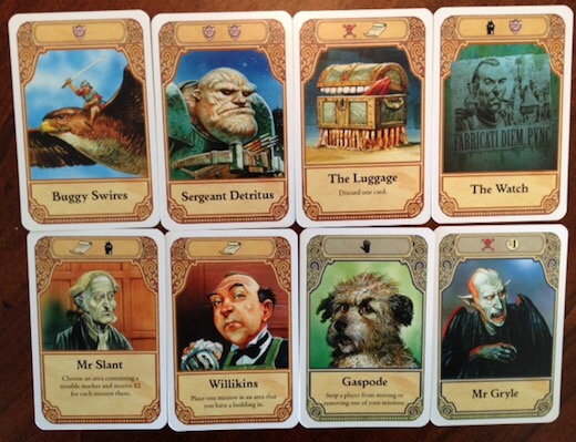 There’s a nice trouble mechanic. A black cube pops into existence when someone enters a location. Evidently nobody in the Disk world gets on with anyone else. It takes cards and effort to get rid of these trouble cubes so you can build there (unless of course your mission is to spread trouble)