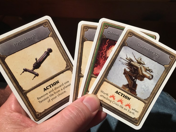 Building stuff increases your income and having the most presence on planets gains you victory points. It’s standard enough stuff but where it gets interesting is the uprisings. Planets don’t like your type around here and as time progresses are more likely to rebel and wipe out your great works and everyone else’s there. Going against your lifelong principles you may find yourself quelling these and helping others by helping yourself or more comfortably sitting back and letter someone else do the dirty work and gaining the benefits. Quelling uprisings is key and a real gamble. It’s a sweet mechanic. (There’s also a third option of ignoring them and having everyone on the planet burn with you when the moon men (or whomever) rise up)
