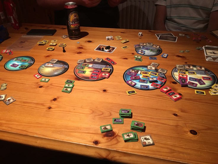 Theme is strong here. It’s all daring do. Steam powered contraptions and outlandish WW1 styling, larger than life heroes and death rays. I love the vibe. Games are close run with plenty of cock blockery and the occasional rumble. It whizzes along at a jolly old pace and it scales well with more players (max 5)