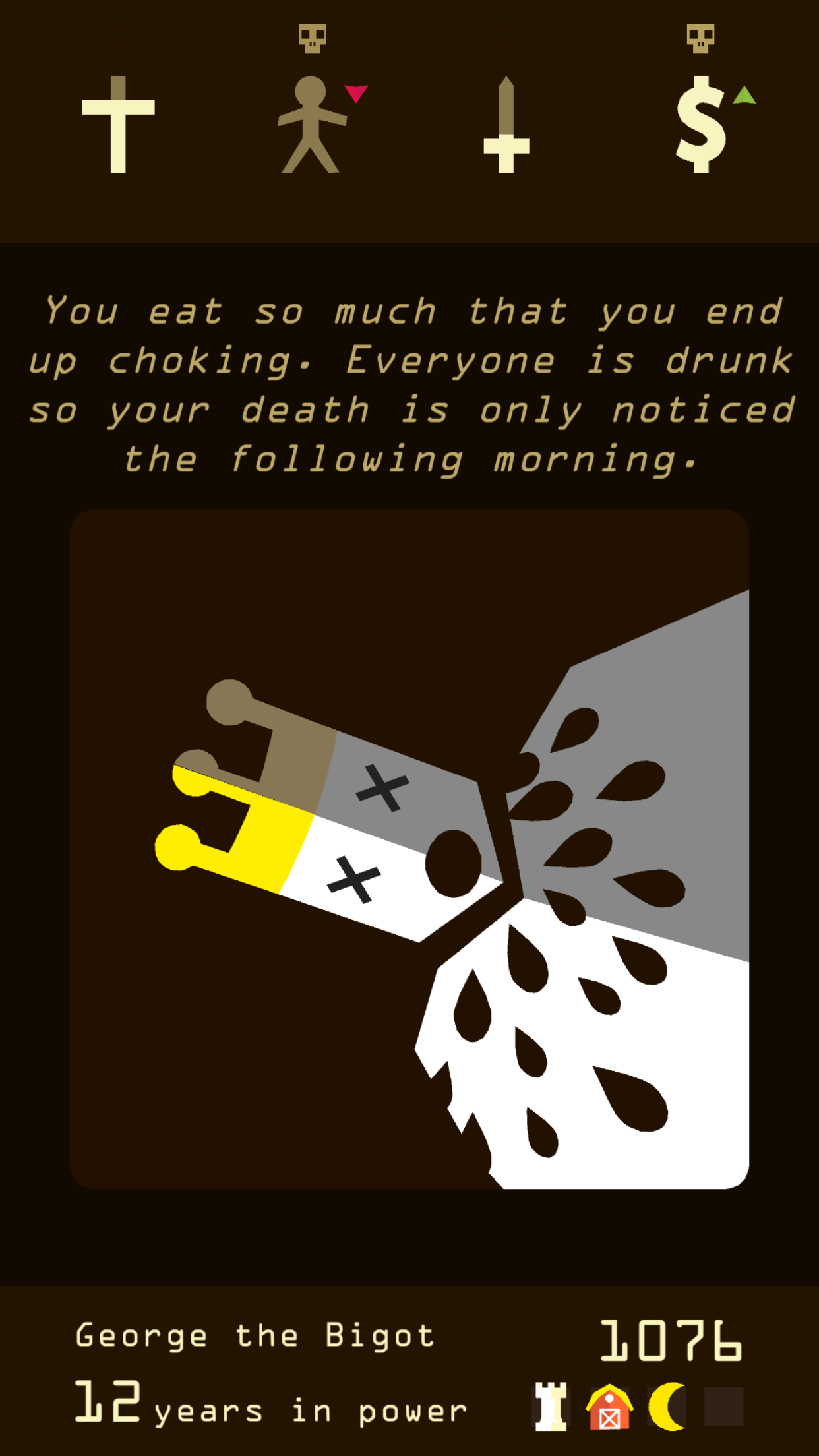 It’s not a serious game. Sometimes it’s impossible to continue no matter what choice you take and that’s ok although I would prefer everything based on my decisions rather than luck based. Maybe it is and I’m just a terrible King.