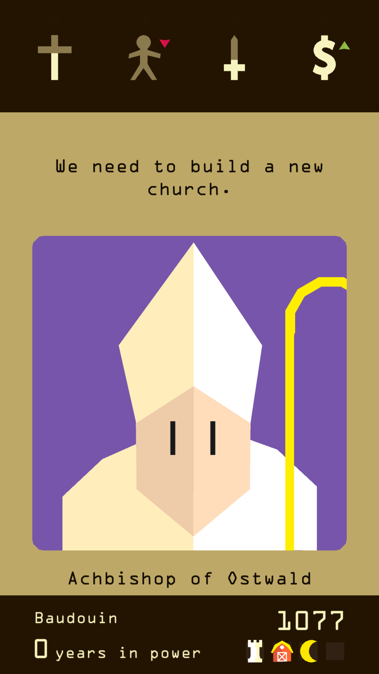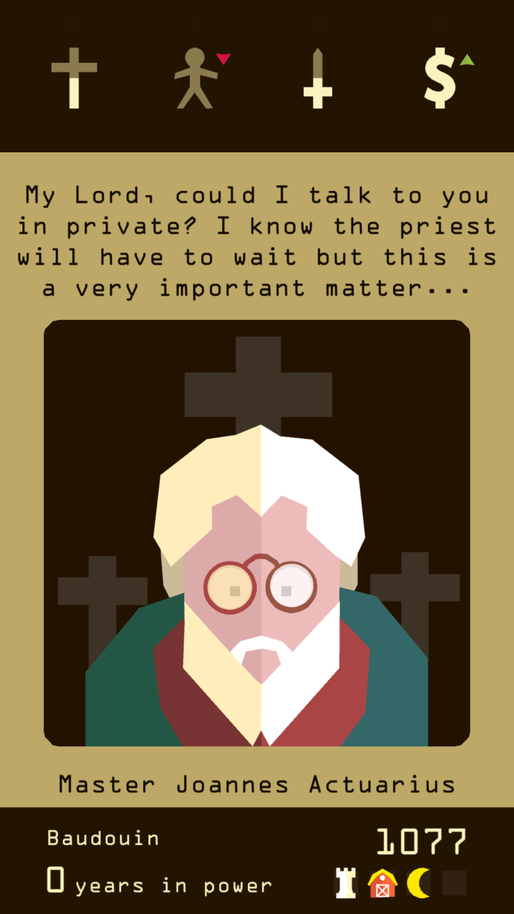 A resource dropping to zero spells the end for your reign as does pushing any resource too high. Too much church power and they rise up and take over and so on. I’m not saying it’s turn based flappy birds…. But It’s sort of turn based flappy birds.