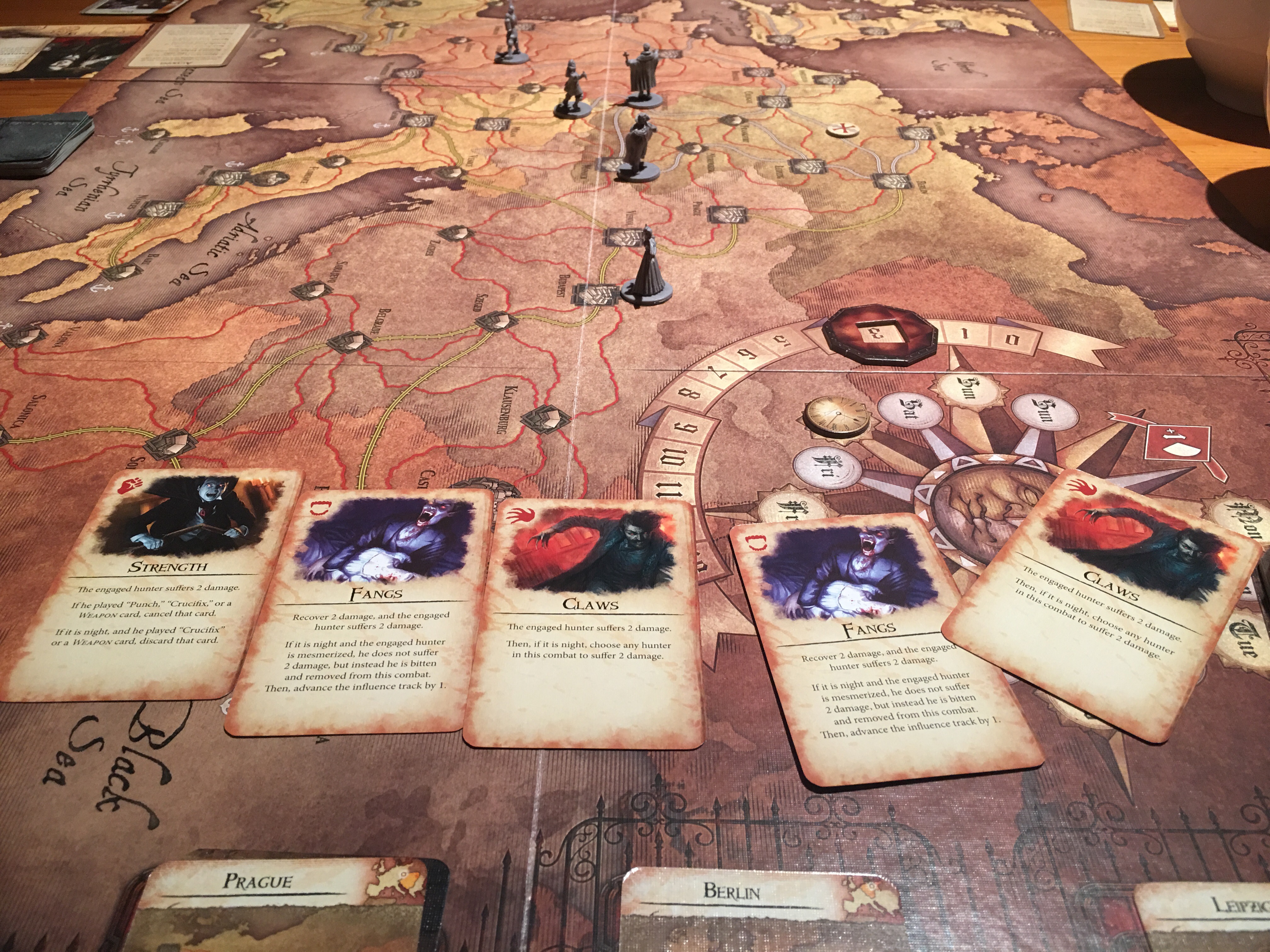 The night and day cycle has been messed up. Before you had day lasting a few turns then night lasting a few turns and so on. Hunters had to be careful at night. Dracula was very powerful. Likewise Mr D had to avoid contact in daylight or face certain death. Now it flip flops and it’s impossible to build a plan around it. Combat has definitely been simplified and improved but it just doesn’t seem as dramatic or tense with day and night. I remember as Dracula grinning when the sun went down in second ed.