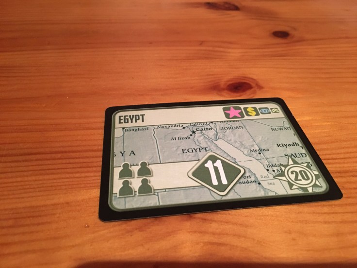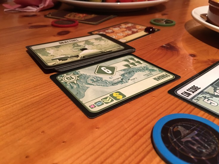 The idea is to score 100 points before your opponent. You do this by winning various missions valued from 5 – 20 points each. Each of the missions is some historical spot where The KGB and CIA tried to gain popular support like Vietnam, Egypt, Turkey and so on. If you’ve played Twilight Struggle you’re in familiar territory.