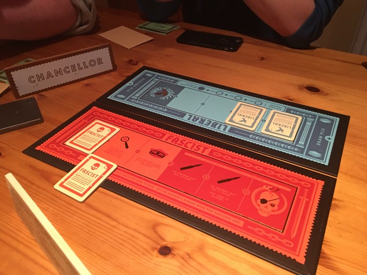 Now the game is afoot and the liberals are racing to score all their agendas before the fascists score three and elect hitler. (Or the liberals shoot hitler or the fascist score six agenda)