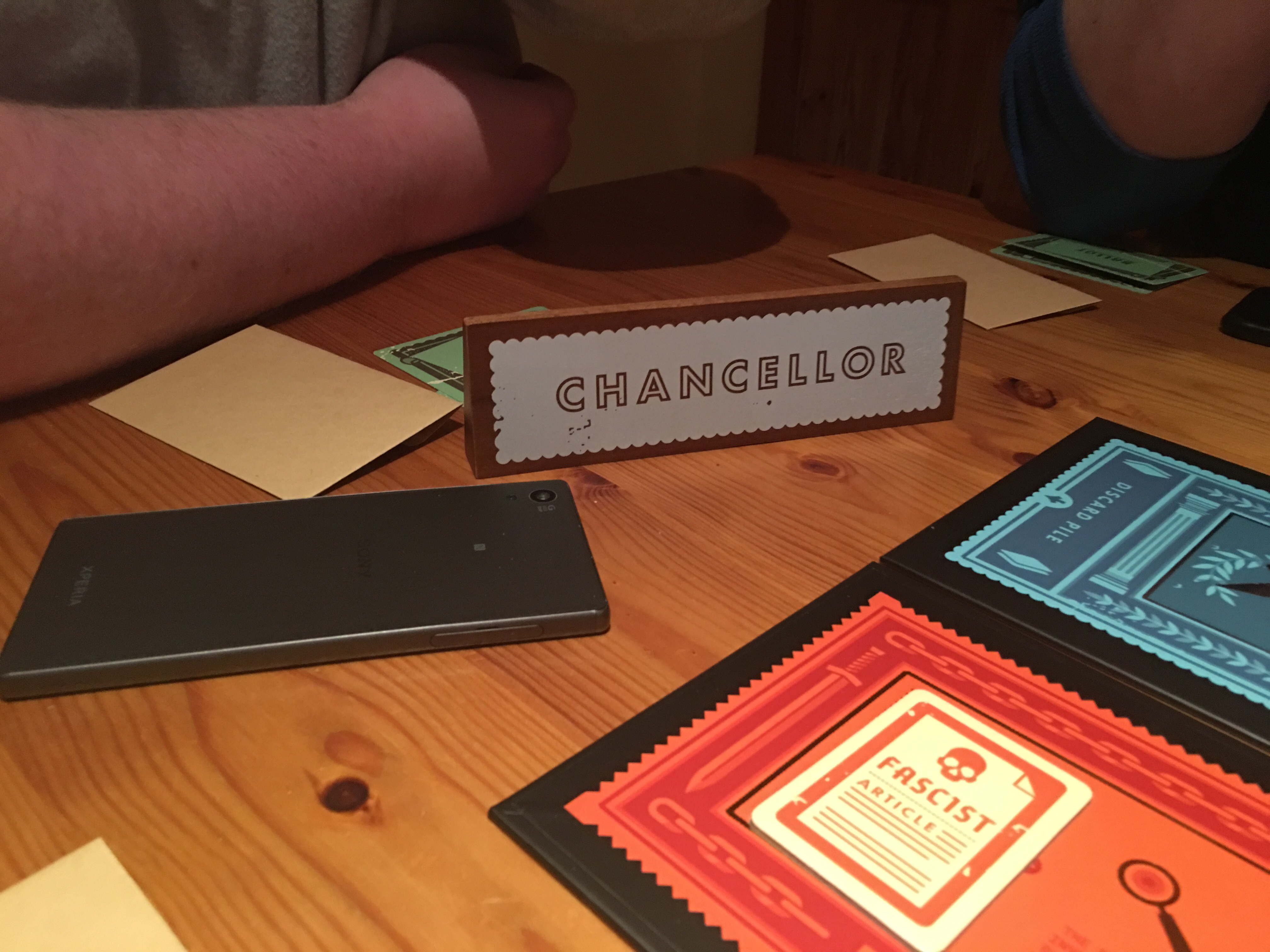 Now the game is afoot and the liberals are racing to score all their agendas before the fascists score three and elect hitler. (Or the liberals shoot hitler or the fascist score six agenda)