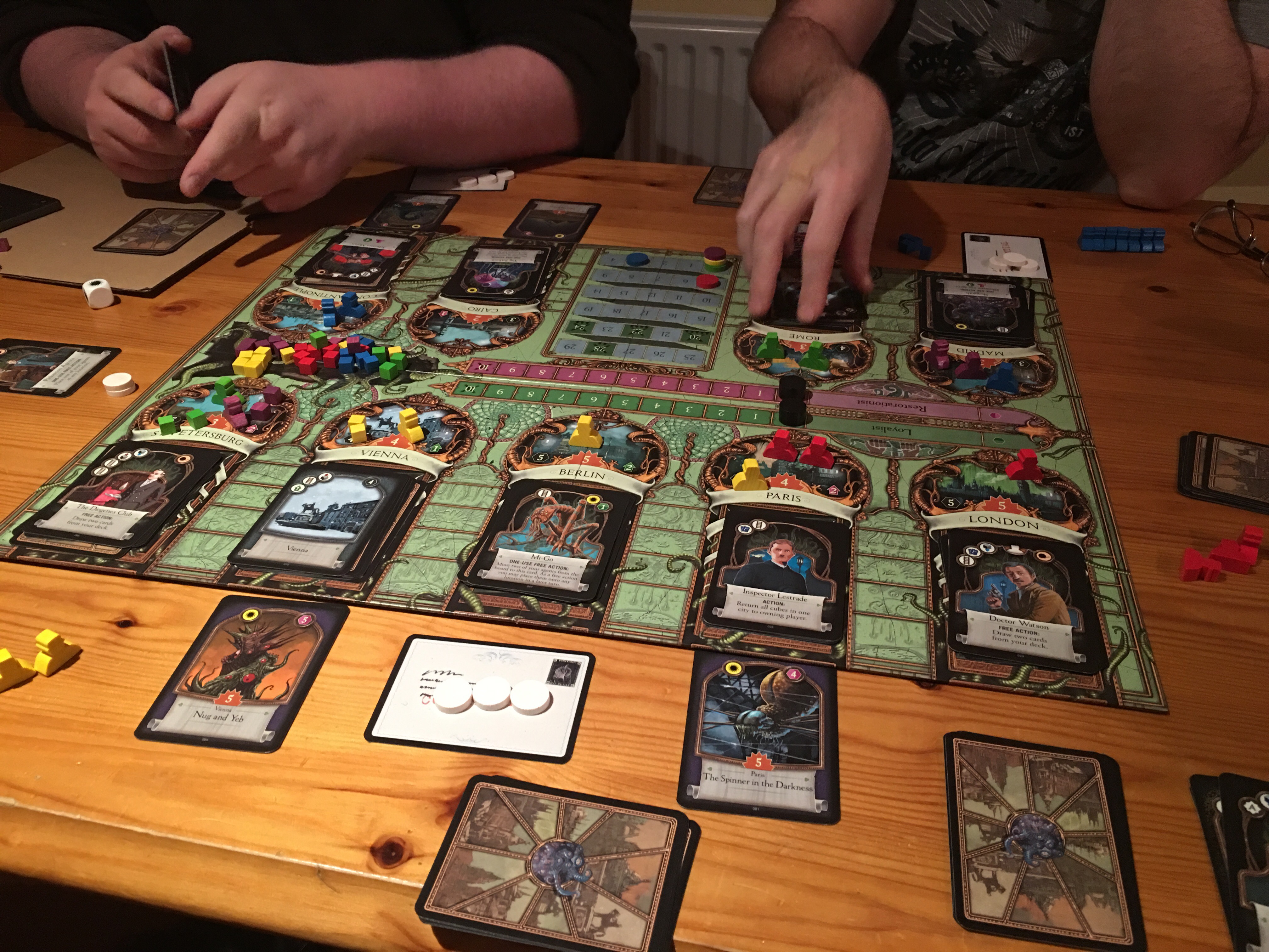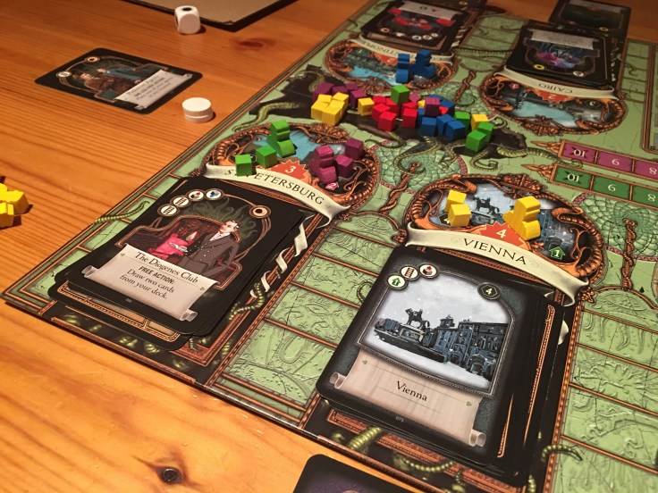 Briefly the game is set in the nineteen hundreds. The great old ones (the plucky rascals) have appeared and taken over the Victorian world. In fact they’ve been in Situ for a number of decades and apart from the enslavement and endless misery it’s worked out pretty well for everyone and by everyone I mean the great old ones. The players take the hidden roles of either loyalists who think everything’s grand, lets not rock the boat or restorationists who want to bump off all the old ones and return the earth to the earthlings. The game plays out on a board with a dozen cities like London, Paris and Madrid as well as more exotic (and potentially dangerous) spots like Constantinople. Each city has a stack of face down one face up card which you want to take to add to your deck. (This is the drafting part). You do this by putting influence cubes and agents (more than your opponent’s) on a city and then grabbing the card in the following round. It’s a kind of bidding mechanism with ample opportunity for cock blockery. Cards in turn grant resources and powers, assignation being a key one for bumping off old ones and enemy agents.