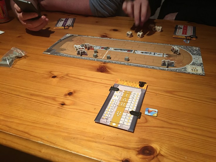 You know Through the Ages? There’s another game, lesser known called ROLL through the ages that I’m a big fan. It shares the name of the mighty Through the Ages and is a Civ game without a map but the similarities stop there. It’s a sort of Yahtzee style game but a very good one with a race element and a reasonable amount of cock blockery to make it more than a solo experience. I have a copy of it. I recommend you try it. There’s a few versions of it now, Bronze Age, Iron Age. It a Goody. Which brings me on to Chariot Race.