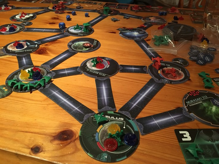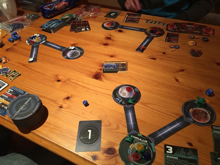 Three players no more no less take the roles of the Federation (sciencey, explorey), Klingons (warlikey, empire buildey), Romulans (fighty, sneaky). (Guess which one I played?). You start with a home world that produces culture (used for peaceful expansion), construction (building ships and bases), science (researching tech, upgrading weapons and shields). Each of the races are a little different and start with a basic Tech. There’s an interesting balance between the three and trade agreements give you a little boost in production. Alliances are fragile but with only three players forgiveness is key.