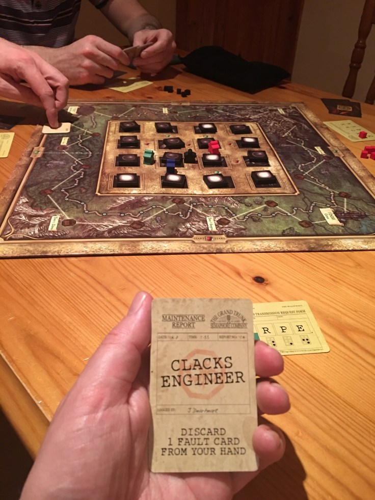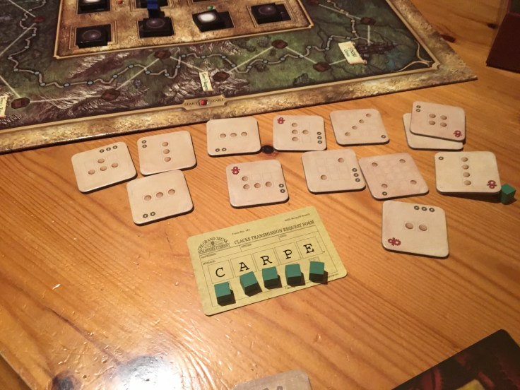 There are some games that click (or clack) easily for me. Games like Robo Rally where there’s a programming mechanic, I tend to do well at. It doesn’t necessarily mean I LIKE that sort of game but at least I don’t lose as much as I do in other games. Enter Clacks, the Terry Prachett one not the other one. It’s based on the clacks communication system from the Diskworld novels. A set of semaphore towers manned by golem operators that repeat messages over long distances. Early telegram if you will. So how do you turn that into a game? If you were to ask a few of the players who tried the game Thur night we cracked it out, they’d tell you you don’t and the designers didn’t.