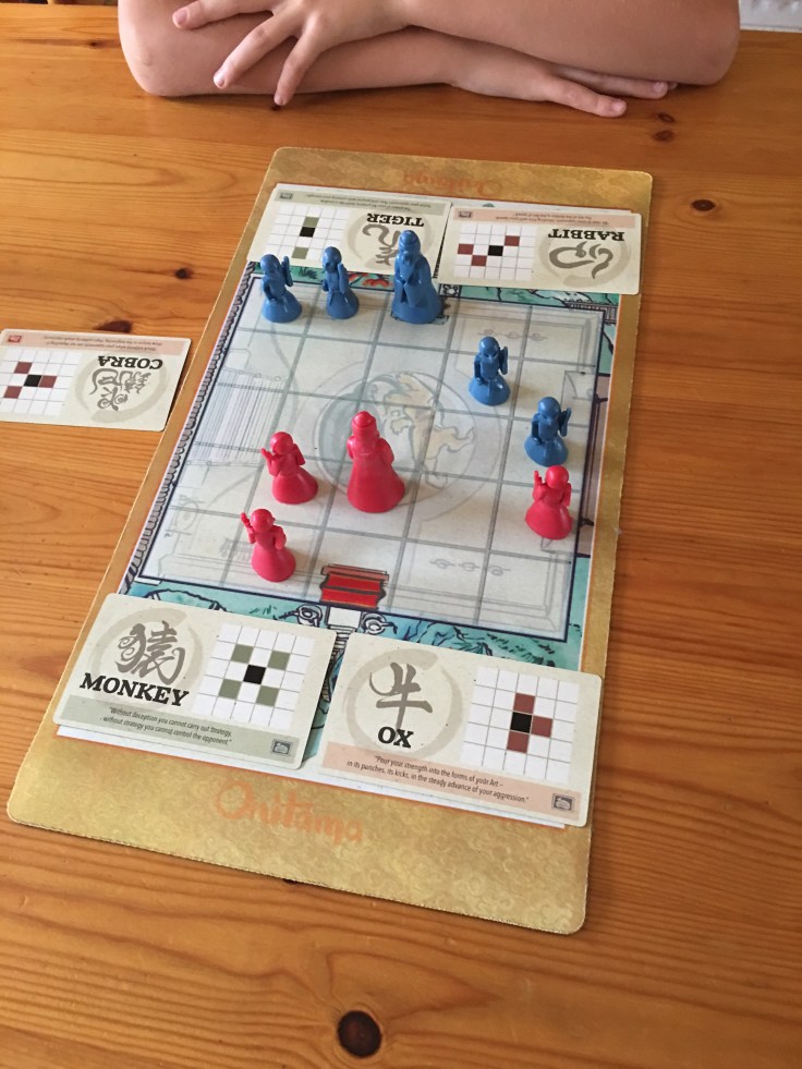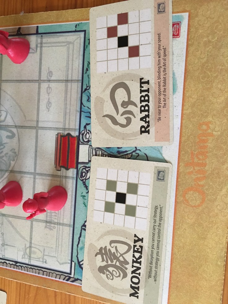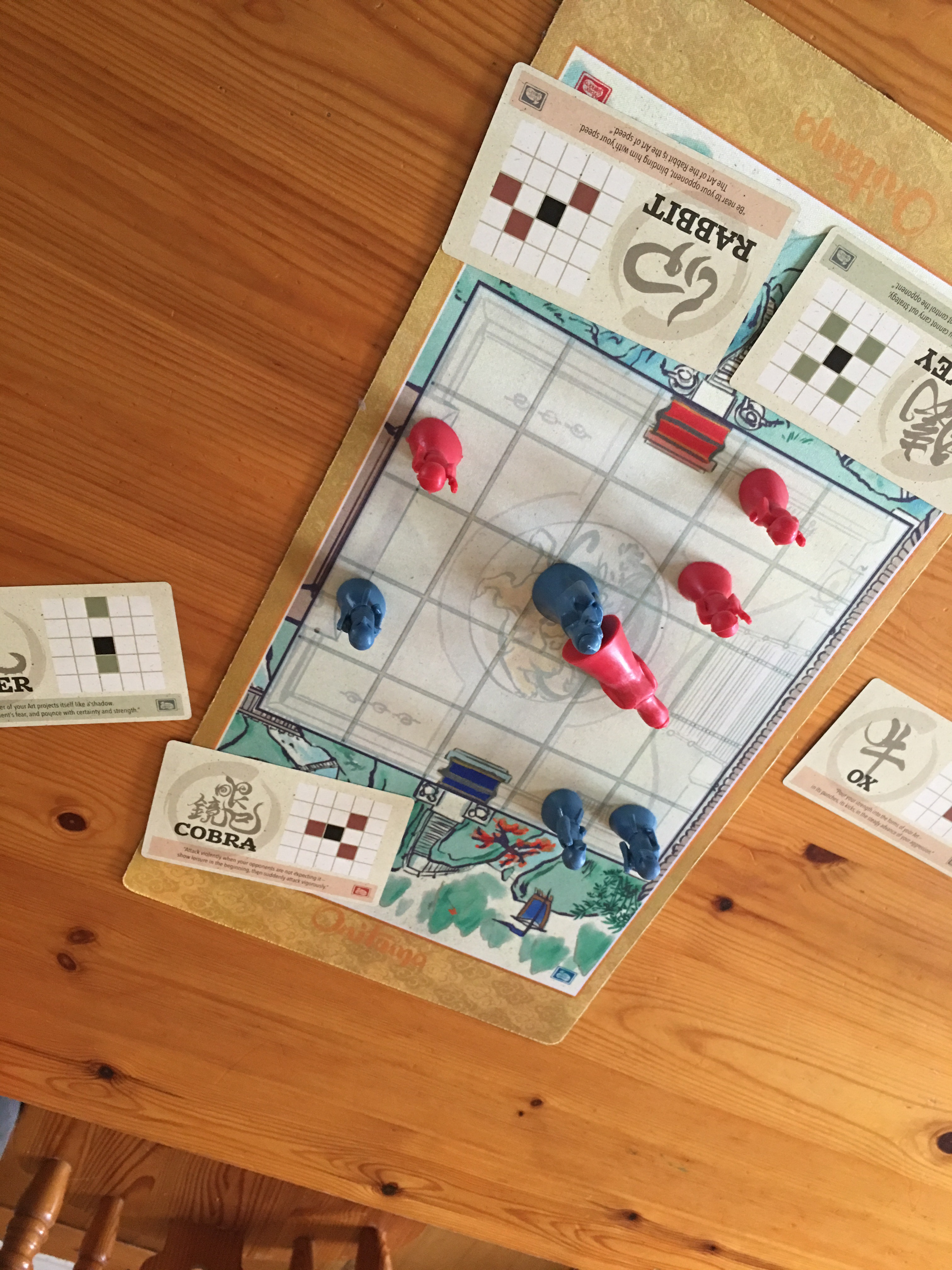 At the start five movement cards are drawn (suitably names after martial arts lore) two for each player and one at the side as the next in line move. The rest go back in the box. Players take a turn by picking one of the movement cards in front of them and using it to move one of their dudes onto one of the permissible spots based on the picked card. You then take the next in line card and pass the card you used to the other player as their next in line cards.