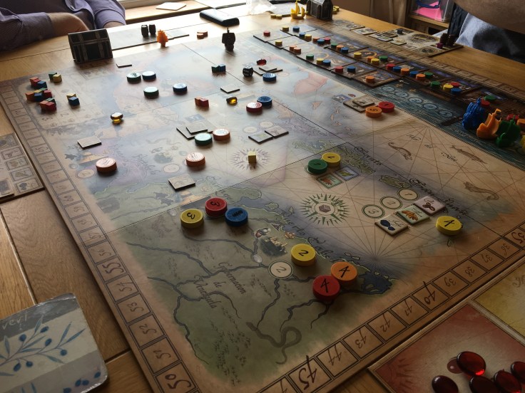 The game is really nicely produced. It’s big. The board is big. The pieces are big. The various chits are big. The box understandably is big. It’s a proper man sized no nonsense Tonka Toy board. I like a good board but it’s often a pain if you combine that with a big player board and sets of cards. I was delighted the player board was small and self contained bar a neat little treasure chest to store and hide your ill gotten booty. The art is good, nothing stellar but more than adequate and not overly distracting. The whole thing feels good and solid when you play it. It’s like a Volvo of a game.