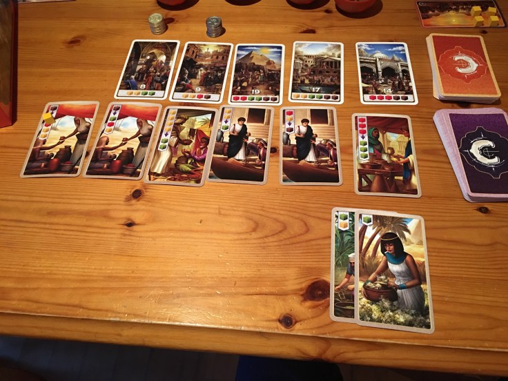 The playing field is split between scoring cards and economy building cards. Six scoring cards are laid out across the top randomly drawn from the stack on the right. Seven economy building cards under it randomly drawn from the stack on the right. (A playmat would be good)