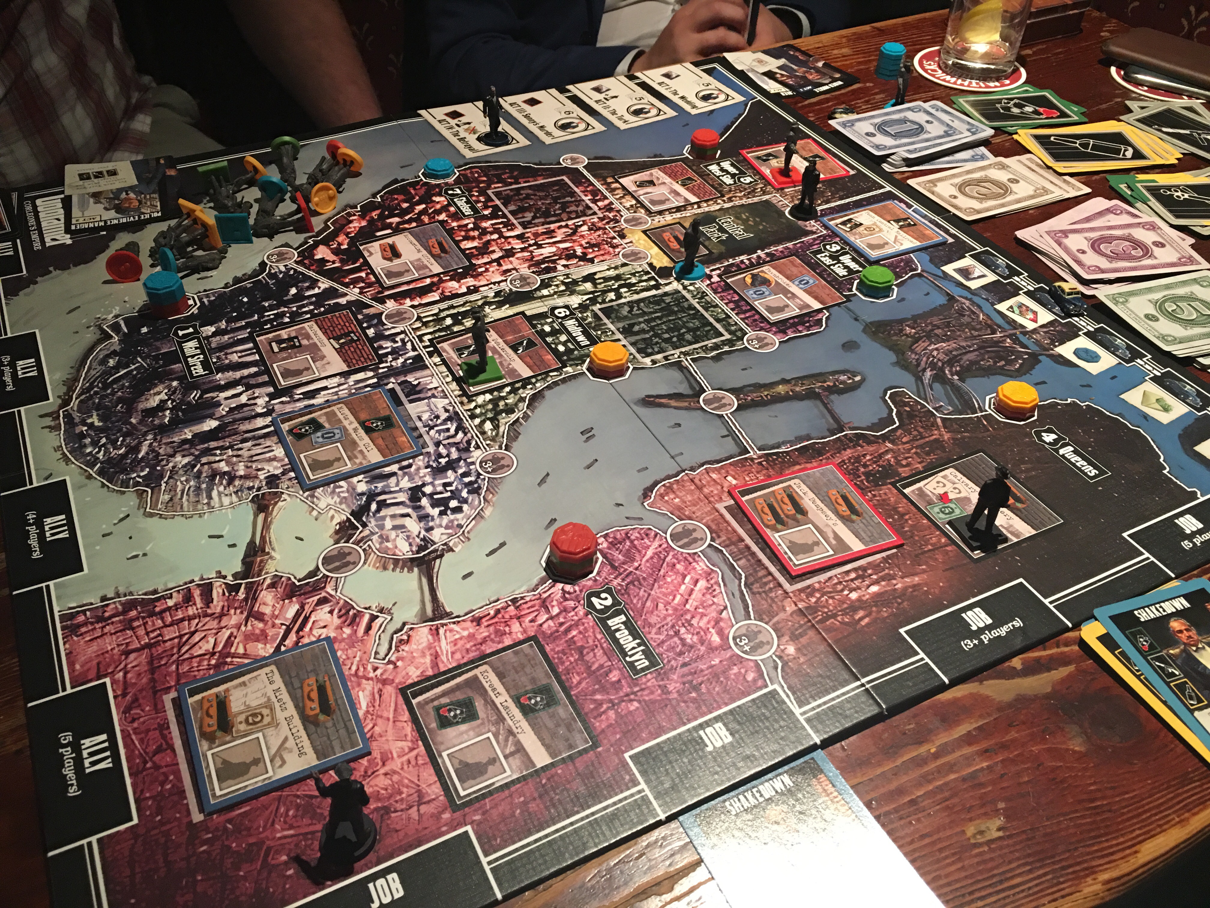 The game is played out on a map of New York which is divided up into eight sectors each with one or more businesses. A business (some of which are fixed on the map and some drawn from a deck each turn) has two spots you can place a mobster worker on. Either a thug in the front of the business to shake it down or a mobster boss who stands adjacent to a number of business and gets them to pay out what they’re doing at the back of the building.