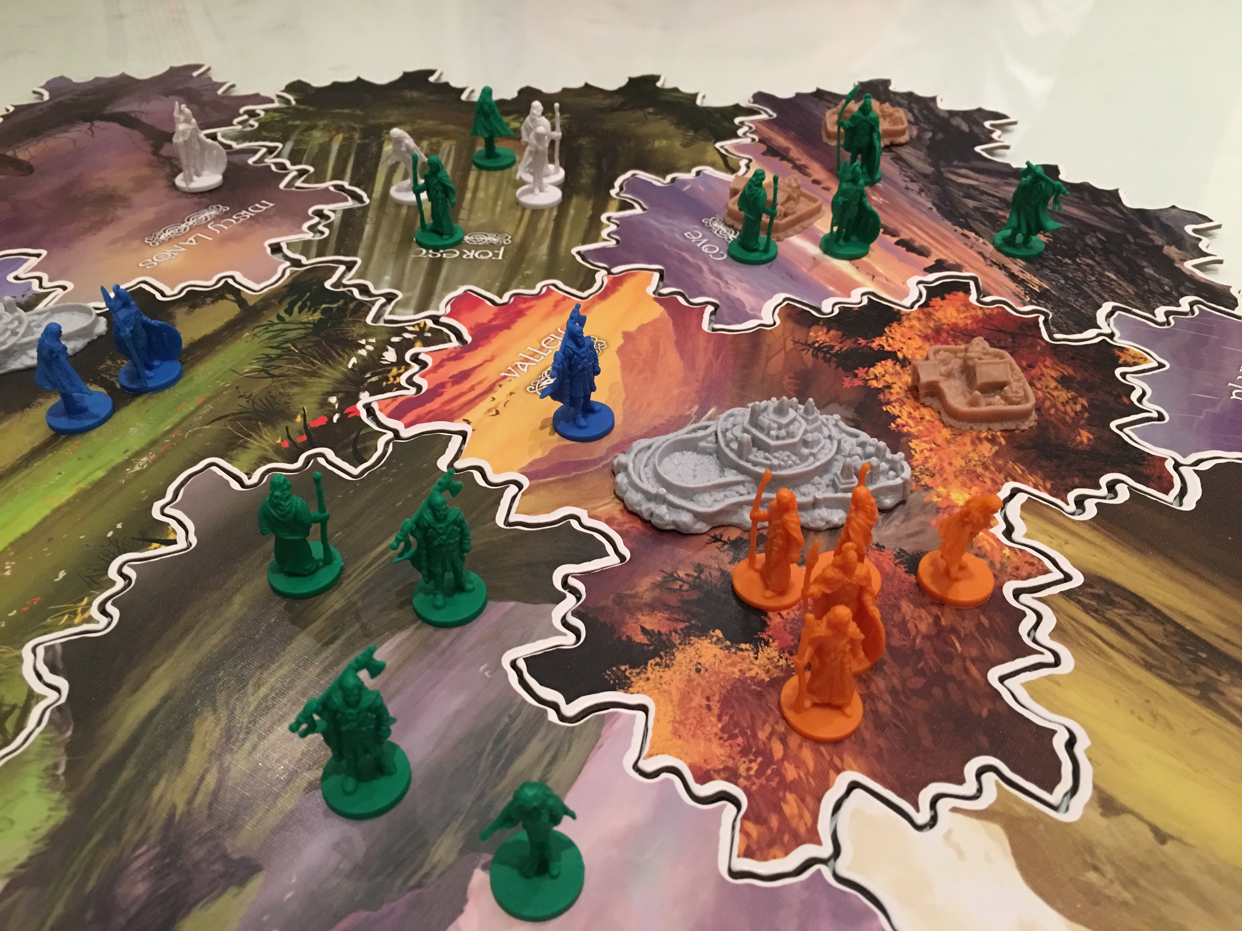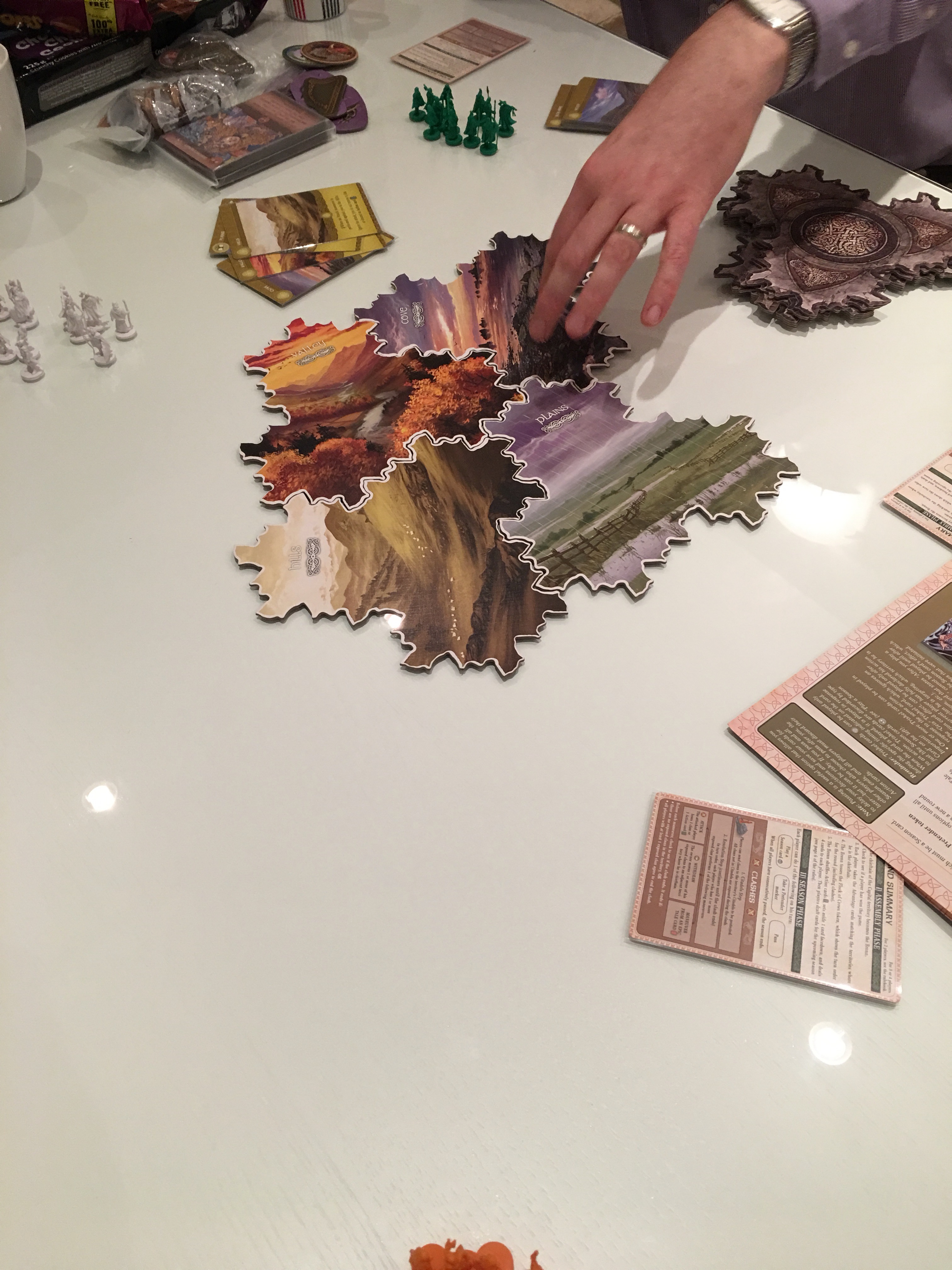 The game starts with a small map of large interlocking pieces. The pieces are gorgeous. The important one being the central citadel, ownership of which determines the first player and one or two other benefits. This is usually heavily guarded and regularly fought over. Players draft a hand of cards from a central pool and these standard cards allow things such as move and fight, defend, build forts, add more warriors and so on. One allows you to explore adding an extra tile and others to draw epic events. Bit of a misnomer to be honest.