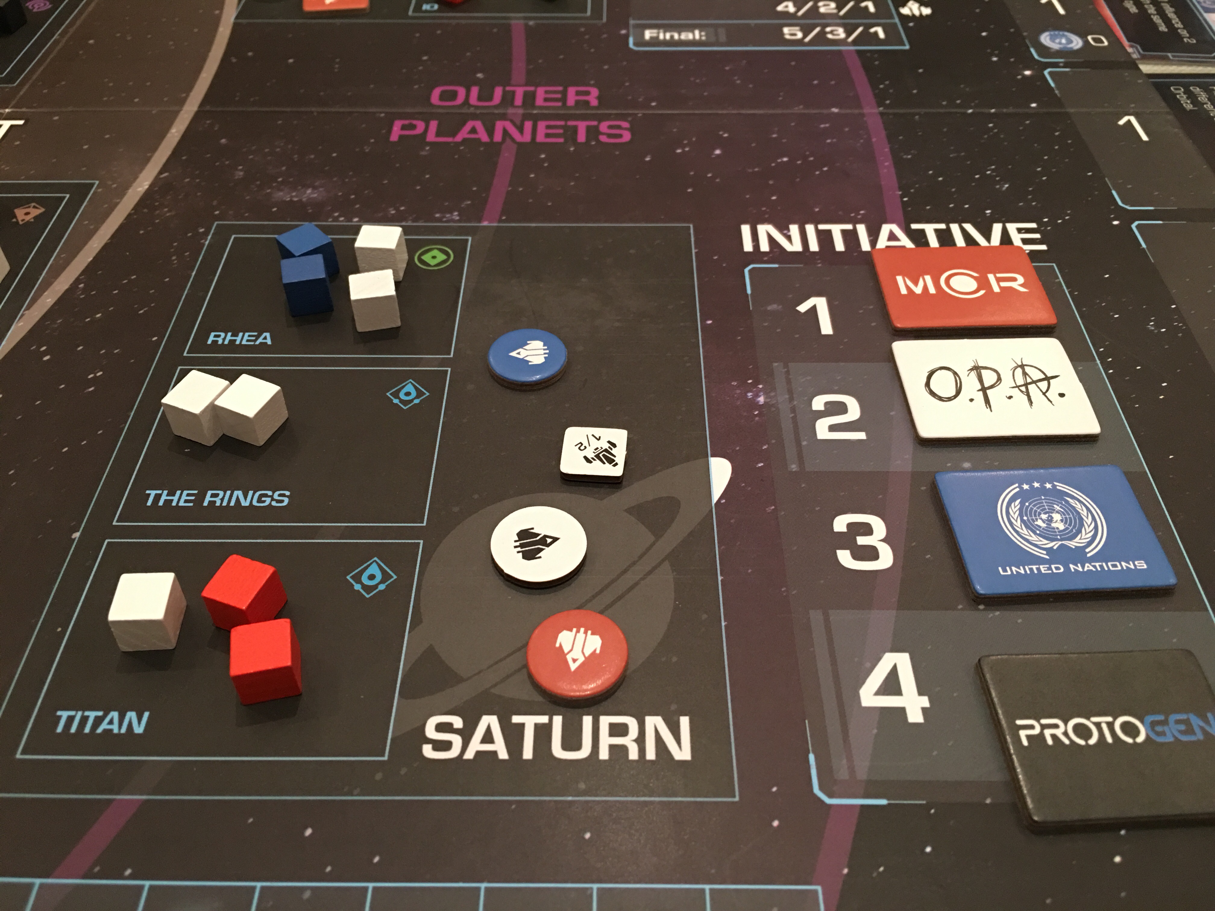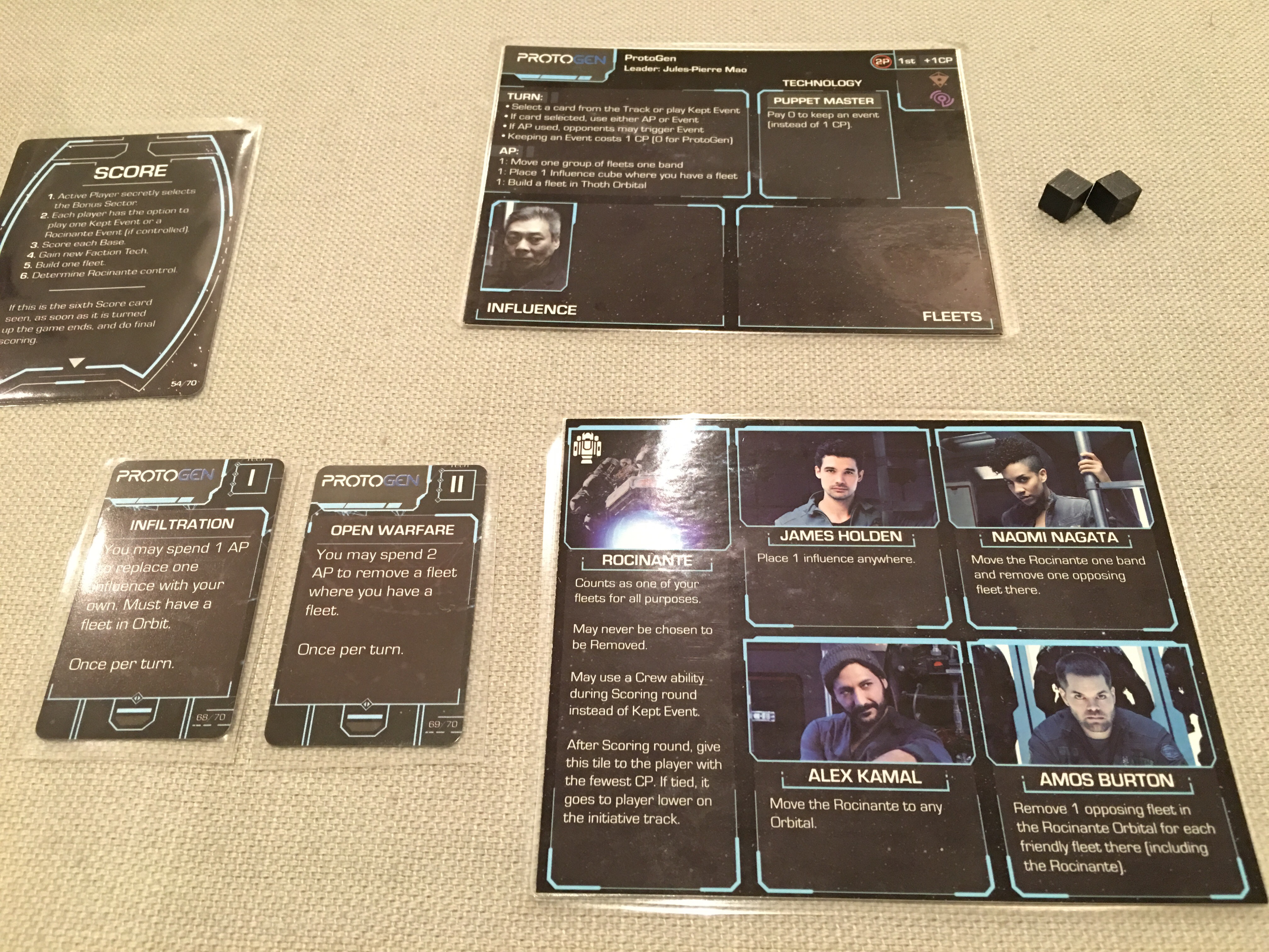 Each faction plays out a little differently, outside of not all the events being applicable to them. Each has got a special ability and each scoring round they acquire a new one. I particularly liked protogen who gets to deploy the protomolecule late in the game in two locations and wipe out nearly all life in those spots. It’s going to take multiple plays to see how each faction plays. They certainly seem true to the books. Earth being all about diplomacy and influence, Mars able military. OPA about terrorism and protogen all evil scientisty.