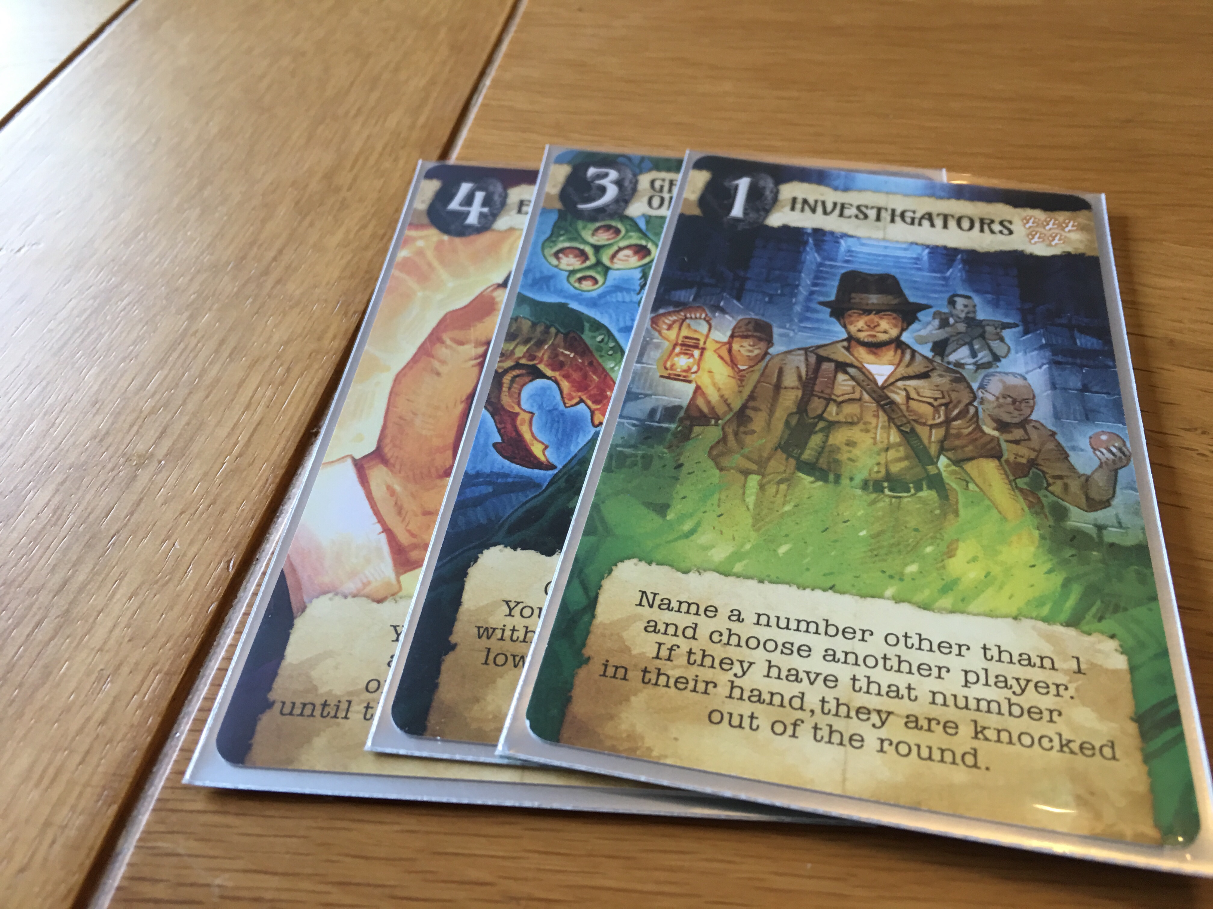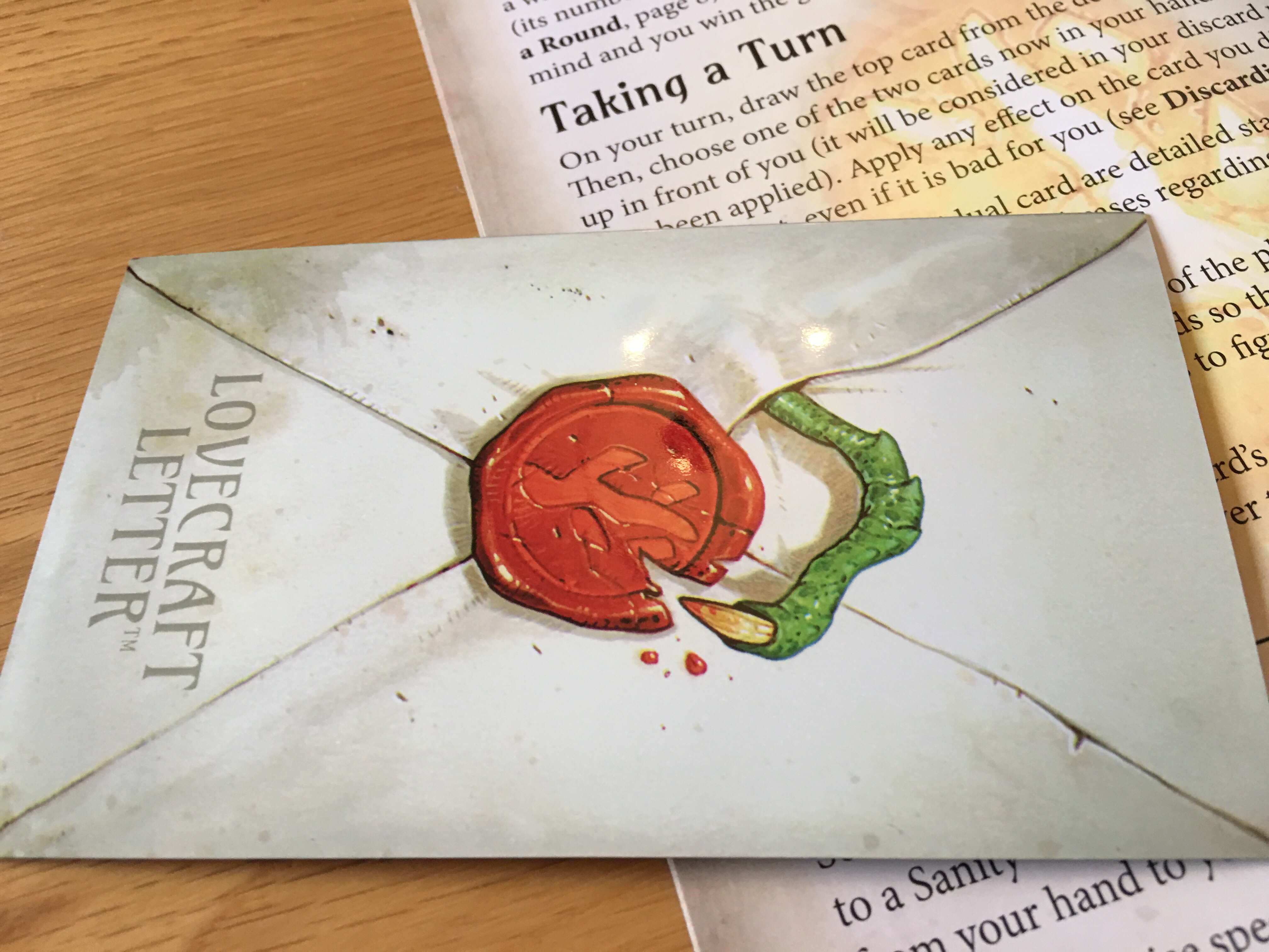 Lovecraft letter is yet another flavor of love letter, the original small footprint card game. It’s a lavish production very similar to love letter deluxe edition. The game is beautifully produced, features oversized cards with natty card sleeves and a nice furry insert (oh err missus) and decent poke chip pieces. Art work is good and the even the box it comes in is swanky. That’s the good bit