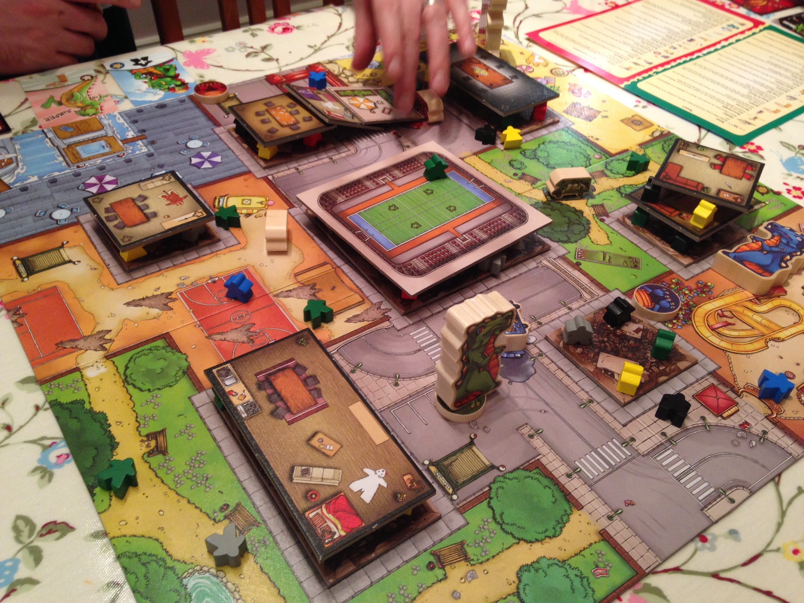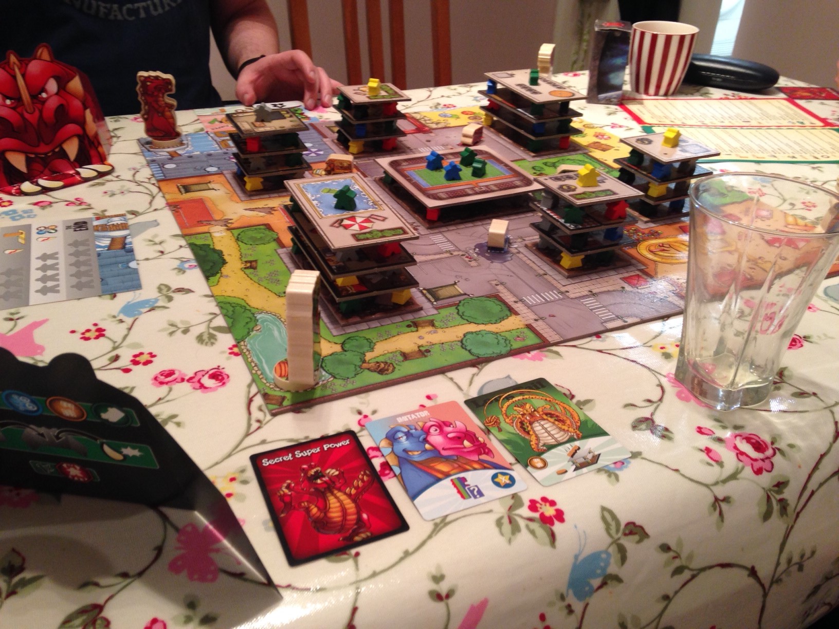 The game is expensive and hard to find as it’s out of print. It’s a pretty sturdy game, it has to be since a lot of the pieces will undergo kinetic testing every round. Big colorful wooden monsters and pieces along with sturdy cardboard building floors makes for a visually impressive set-up