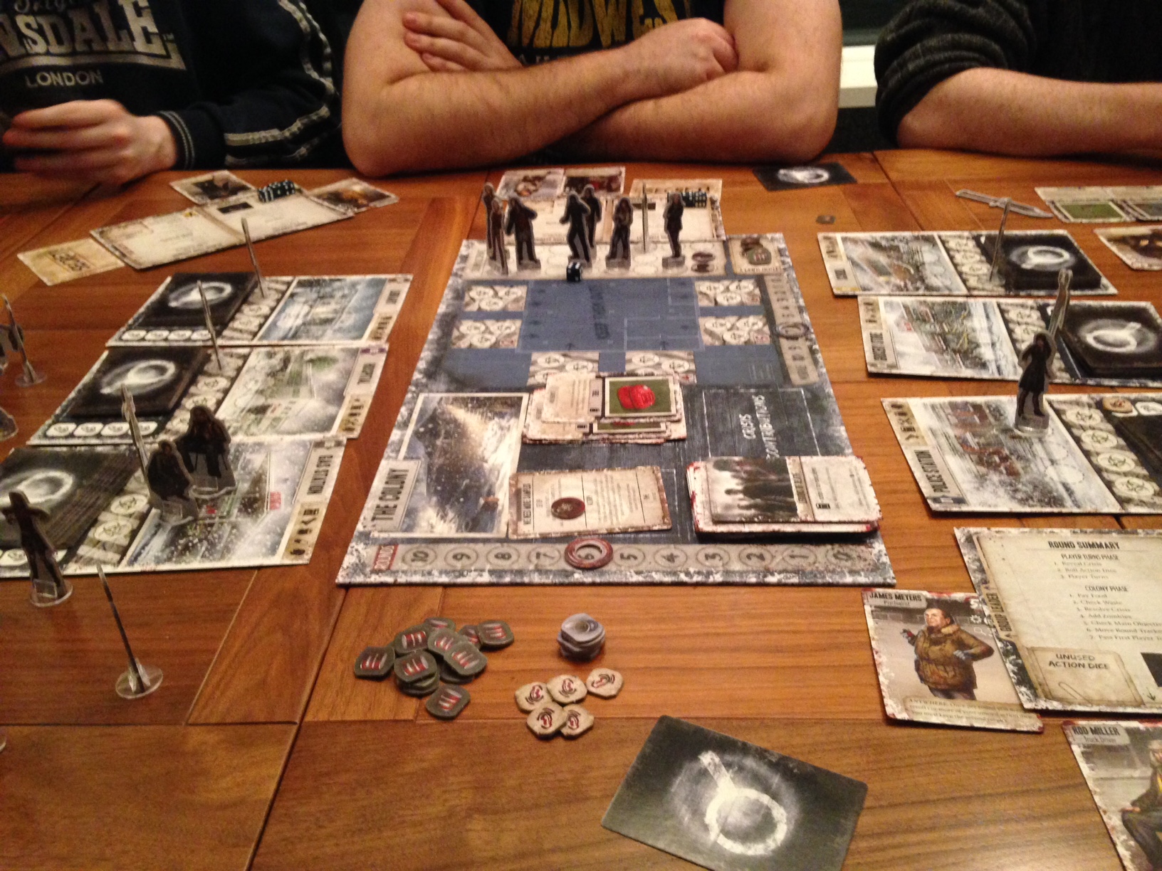 Each turn your group of survivors muck in and try to help the colony survive, this could be by scavenging food, fuel, weapons, building barricades, taking out the trash (it’s true), killing zombies or contributing to a group problem (well the solution to it one hopes)