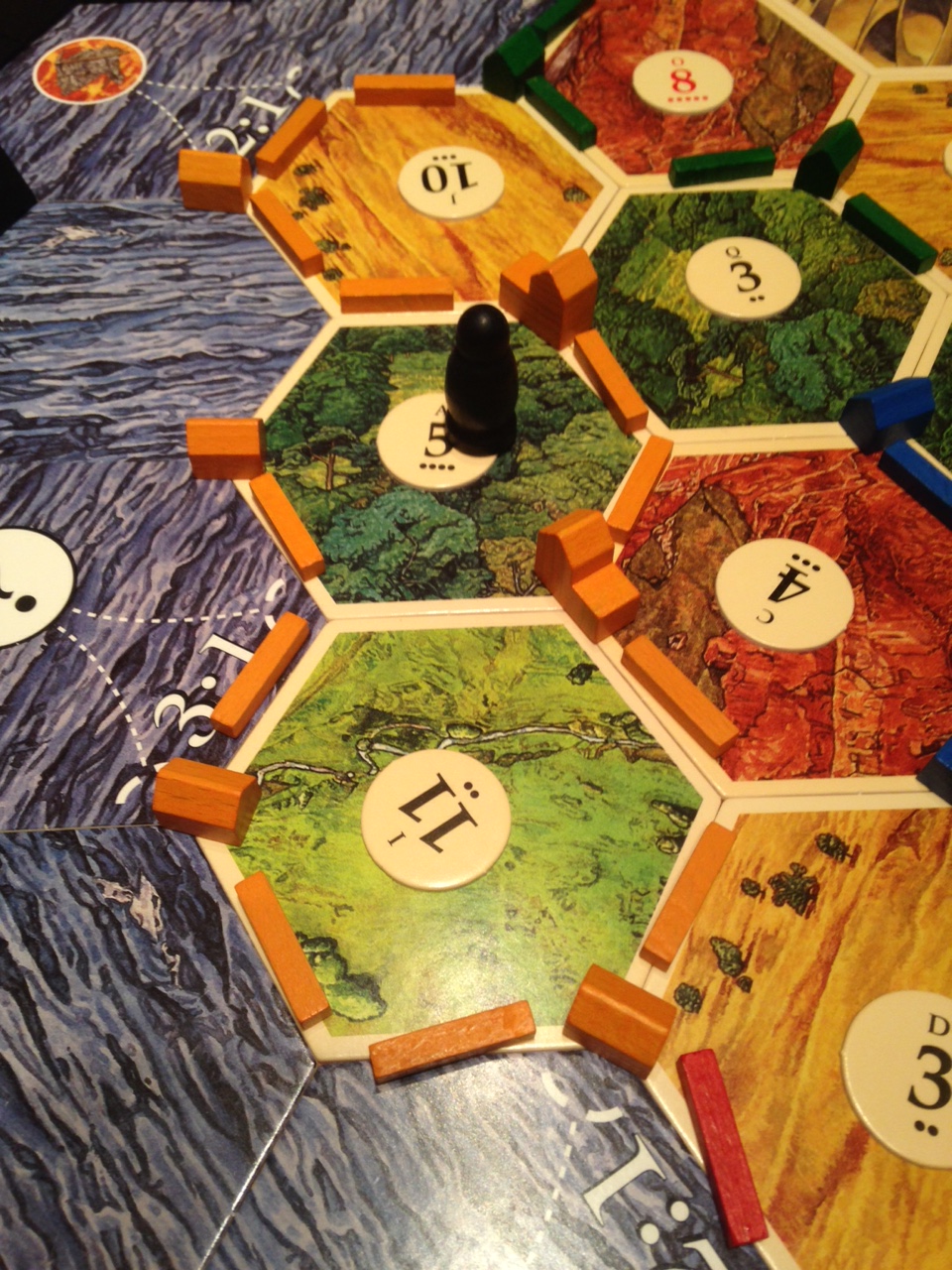 If you haven’t played this game it’s pretty straightforward. A random spread of five possible typed and numbered hex tiles makes up the map. You setup your starting settlements on the edge of them so each of your bases is at the nexus of up to three tiles. Each turn you roll two dice and the corresponding numbered tile pays out to whomever is next to it.